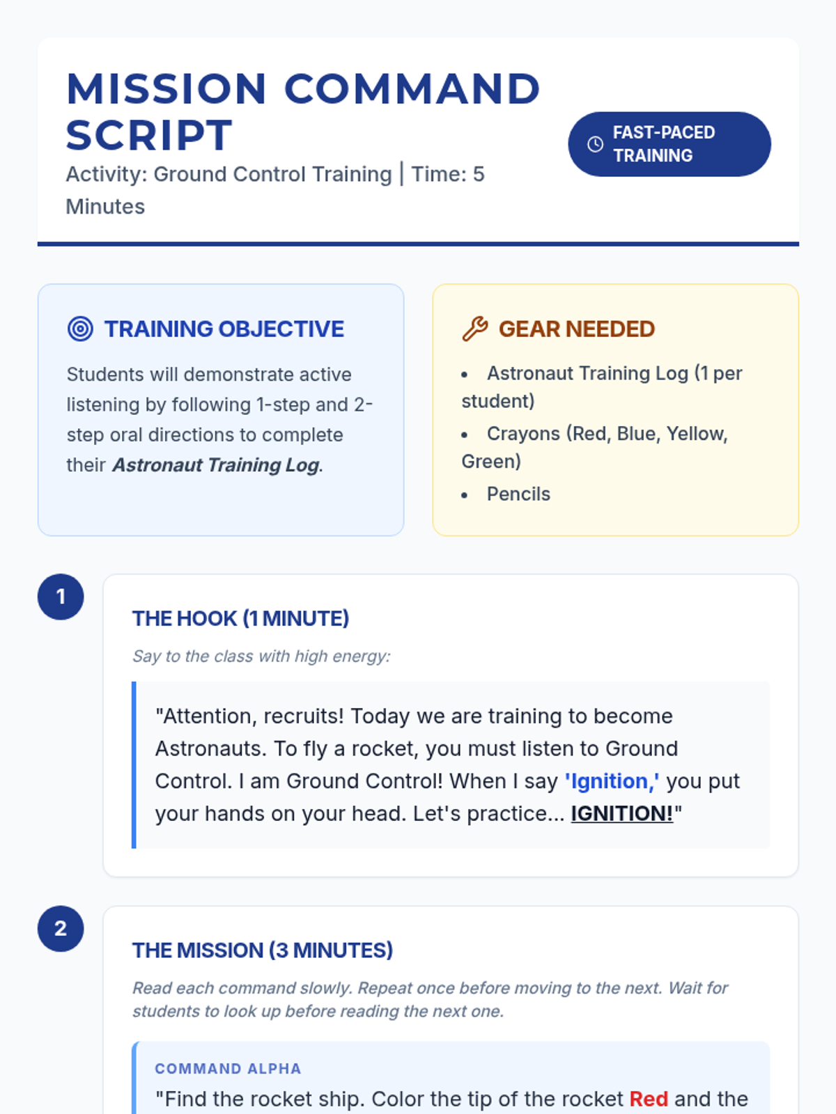 A high-energy, 5-minute listening activity where kindergarten students practice following multi-step oral directions in a space-themed 'Astronaut Training' simulation.