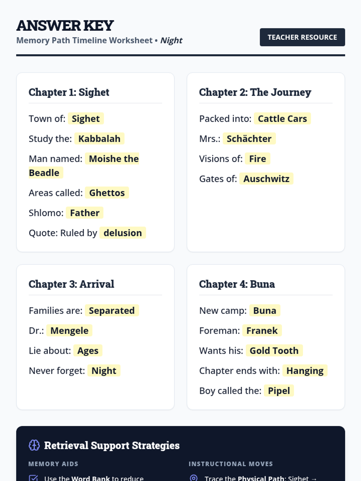 A specialized support lesson for students reading 'Night' by Elie Wiesel, focusing on memory retrieval, chronological tracking, and visual mapping of key events.
