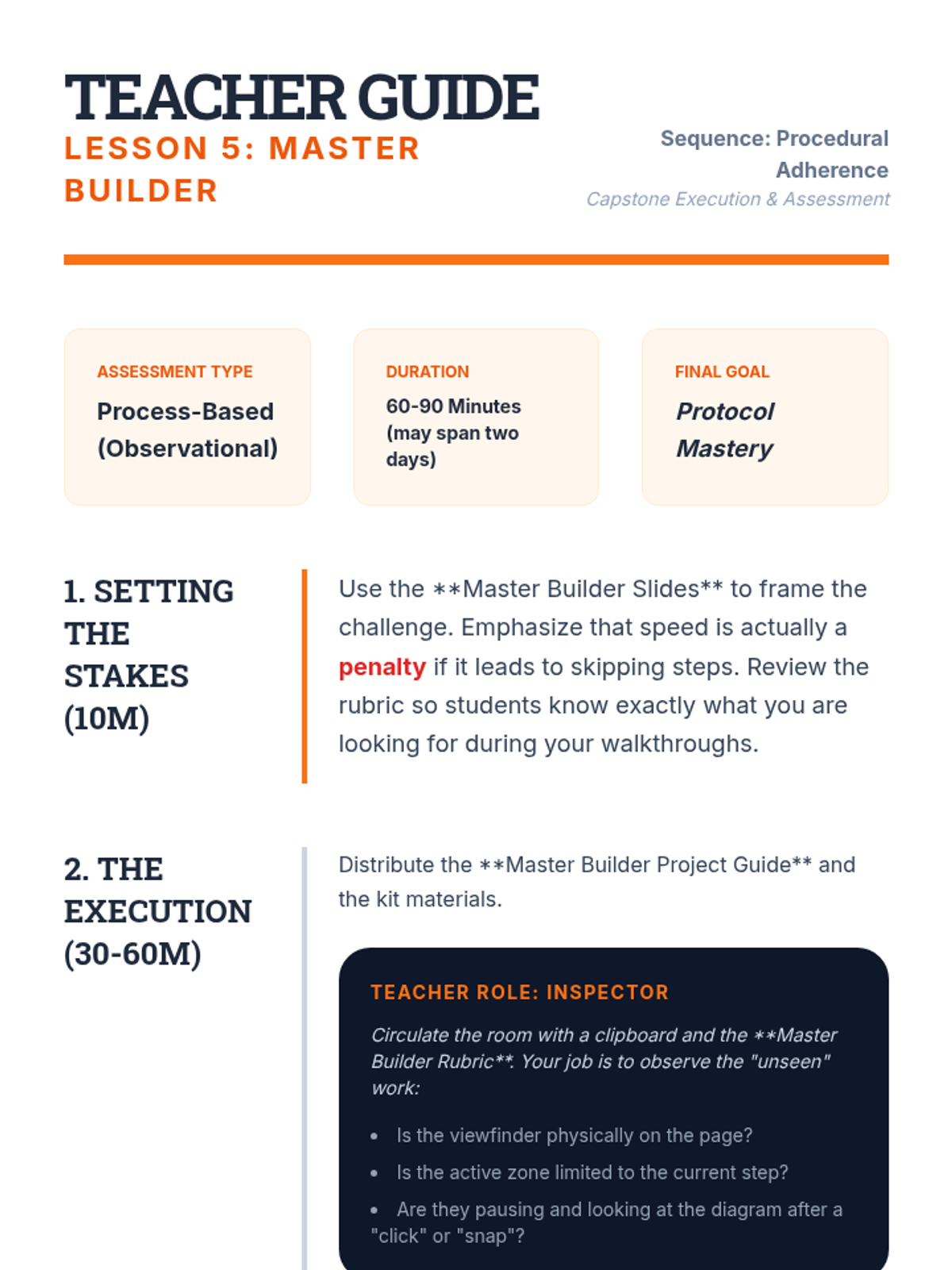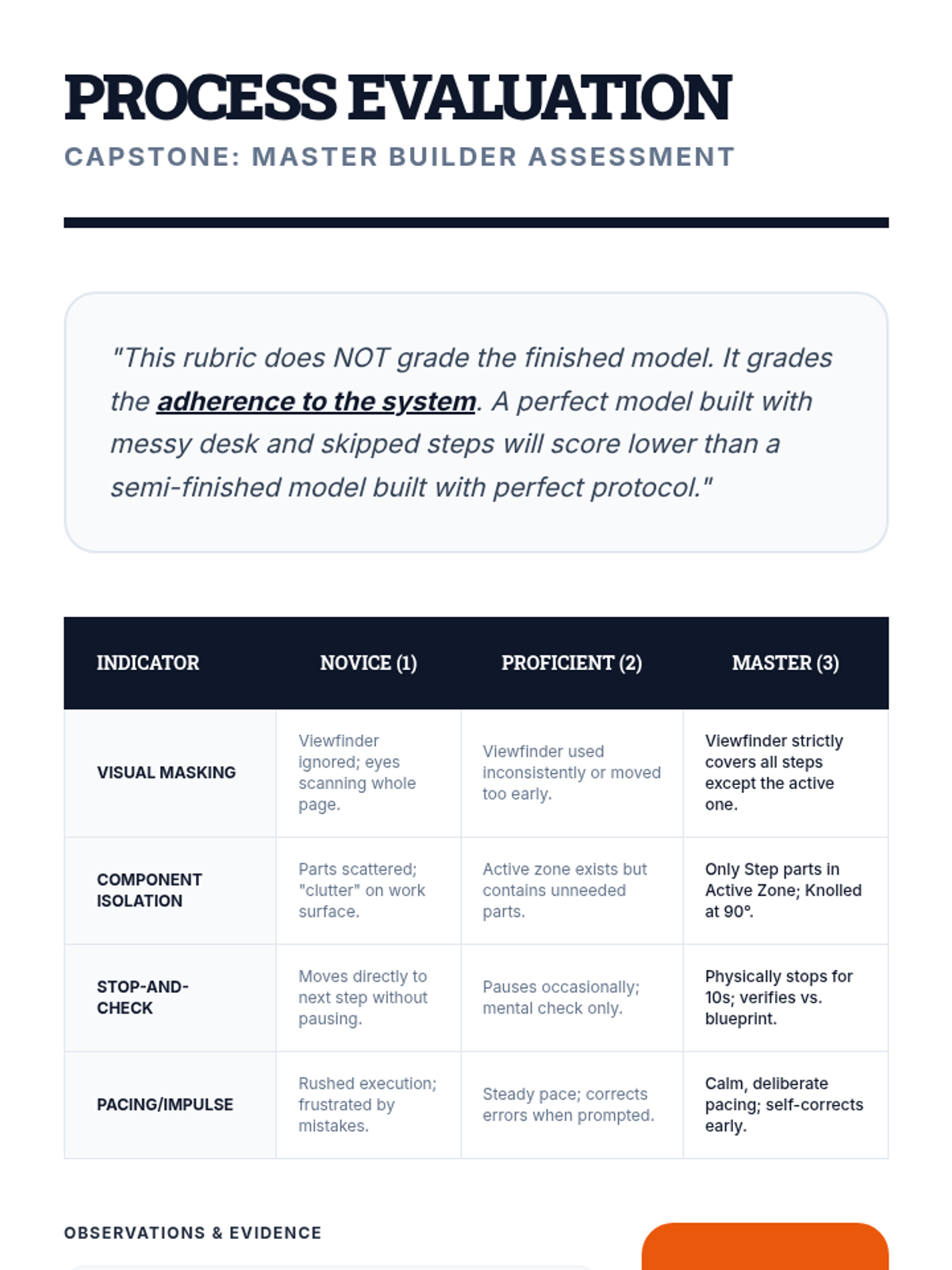 Students complete a multi-stage assembly project (e.g., a simple wood kit or circuit). They are assessed on their adherence to the single-step process rather than just the final product.