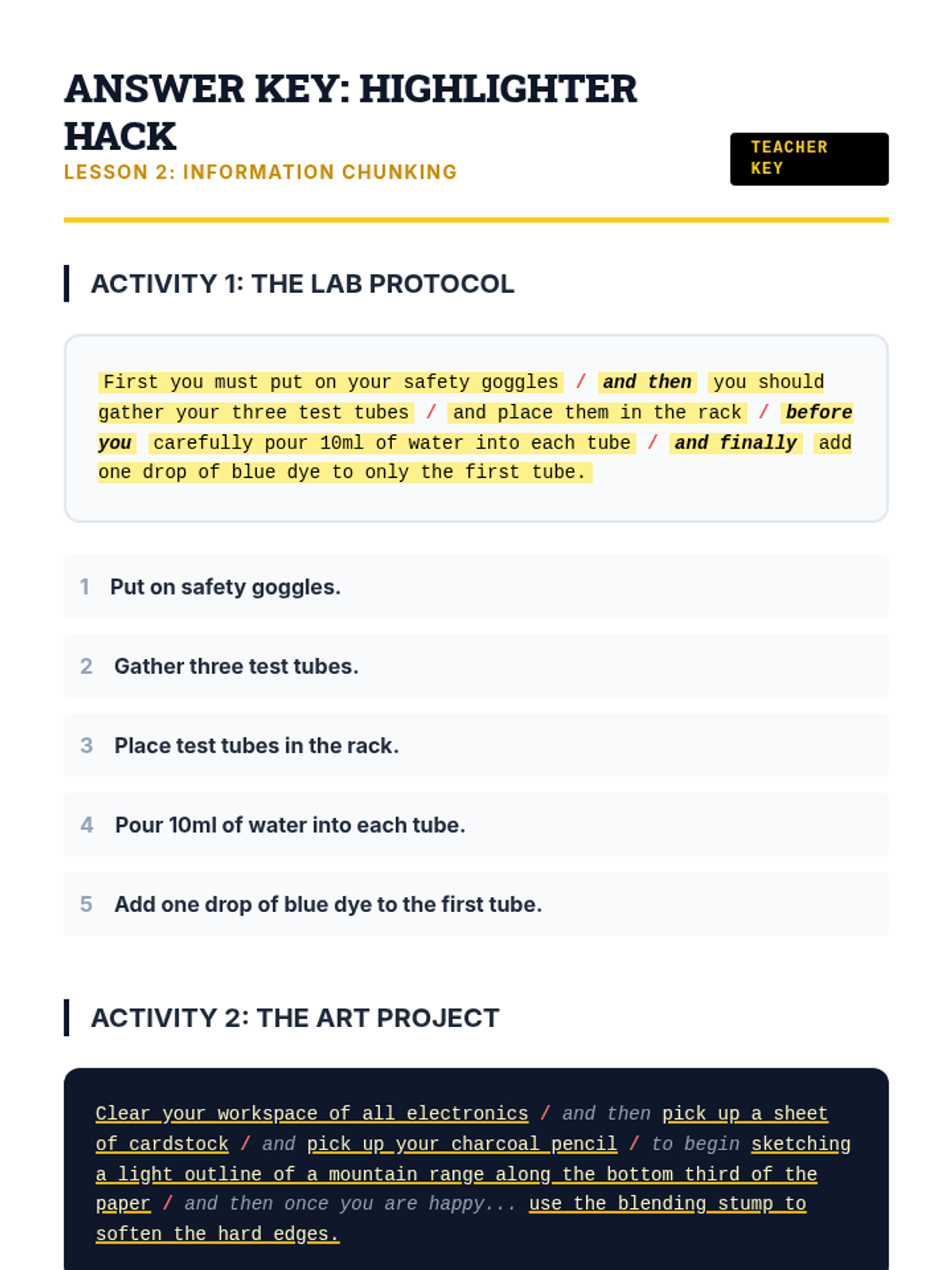 Students learn to use visual tools like highlighters and numbering to divide dense paragraphs of instructions into clear, single-step lists.