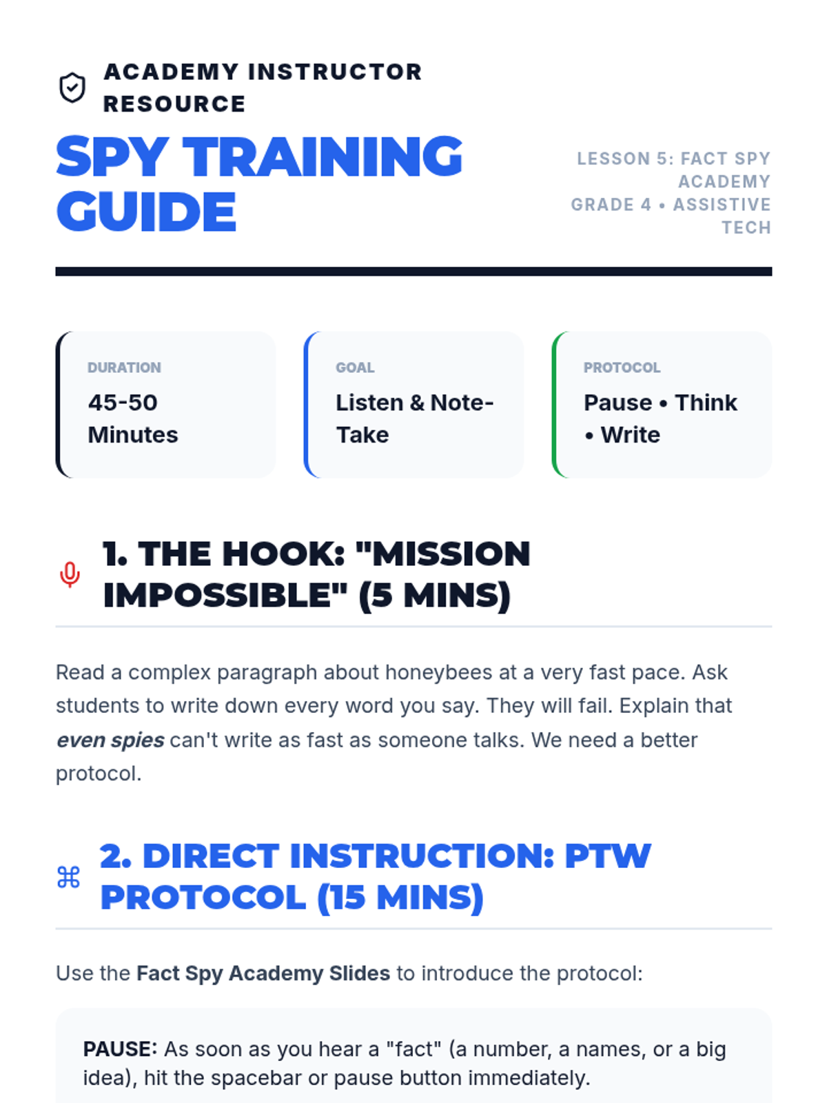 Students learn the 'Stop and Think' method, using the pause button to break dense text into manageable chunks. They practice paraphrasing orally or in writing after every segment played by the TTS tool.