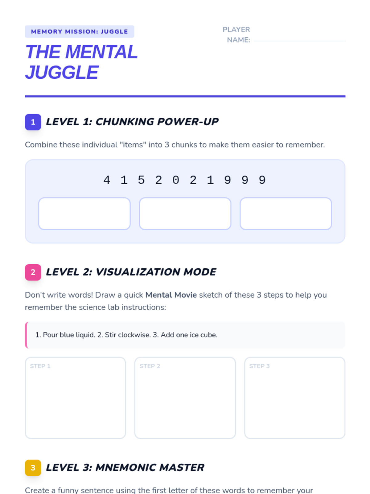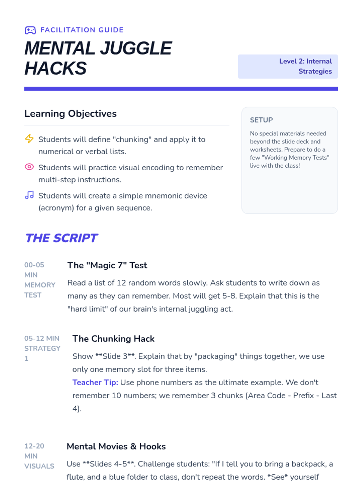 This lesson focuses on internal cognitive strategies like chunking, visualization, and mnemonics to expand the functional capacity of working memory. Students will practice 'juggling' information using mental shortcuts.