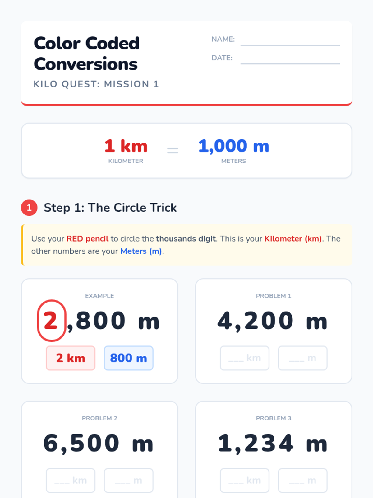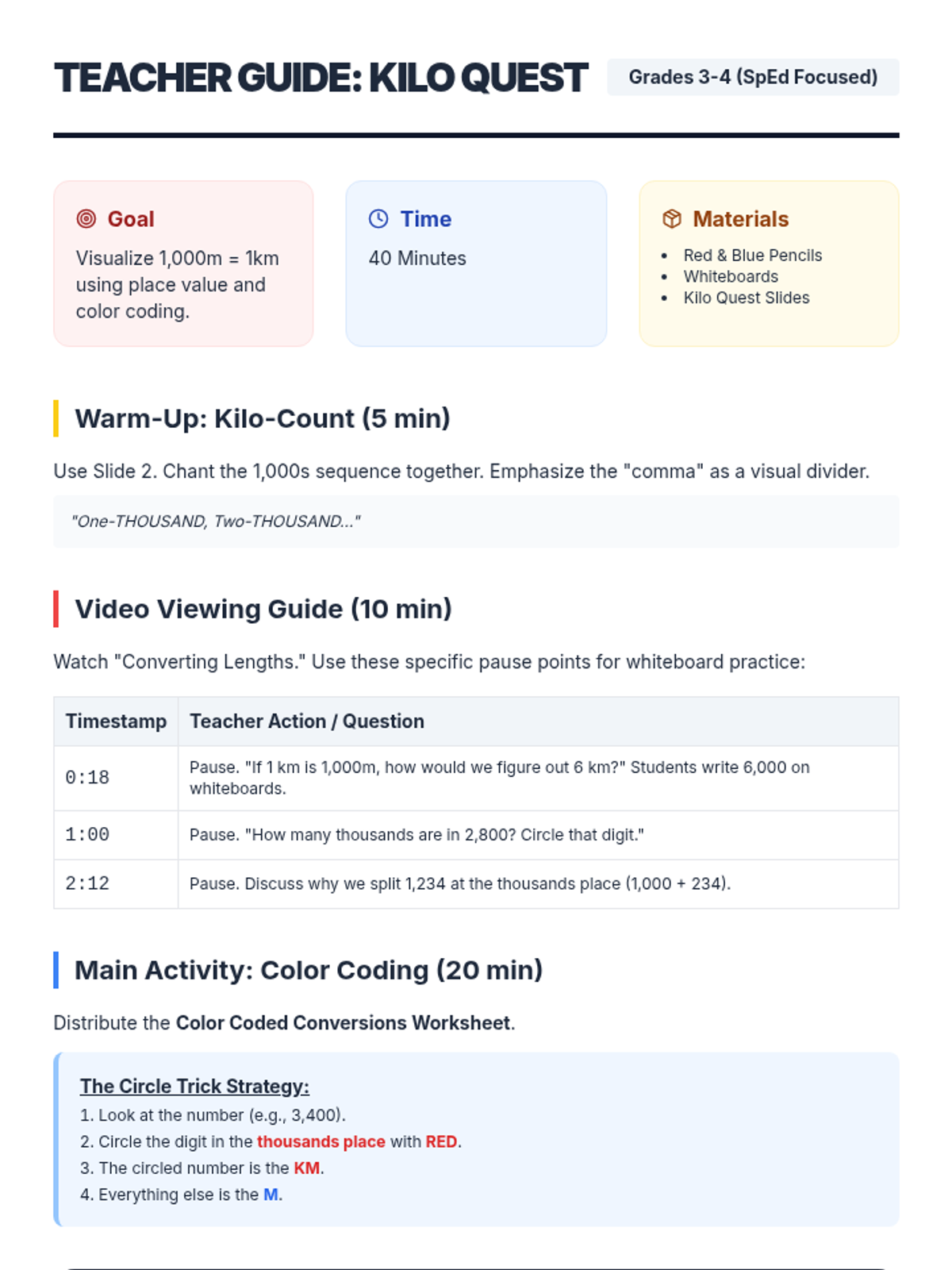 A specialized lesson for 3rd-4th grade SpEd students focused on understanding the visual relationship between 1,000 meters and 1 kilometer using color-coding and video modeling.
