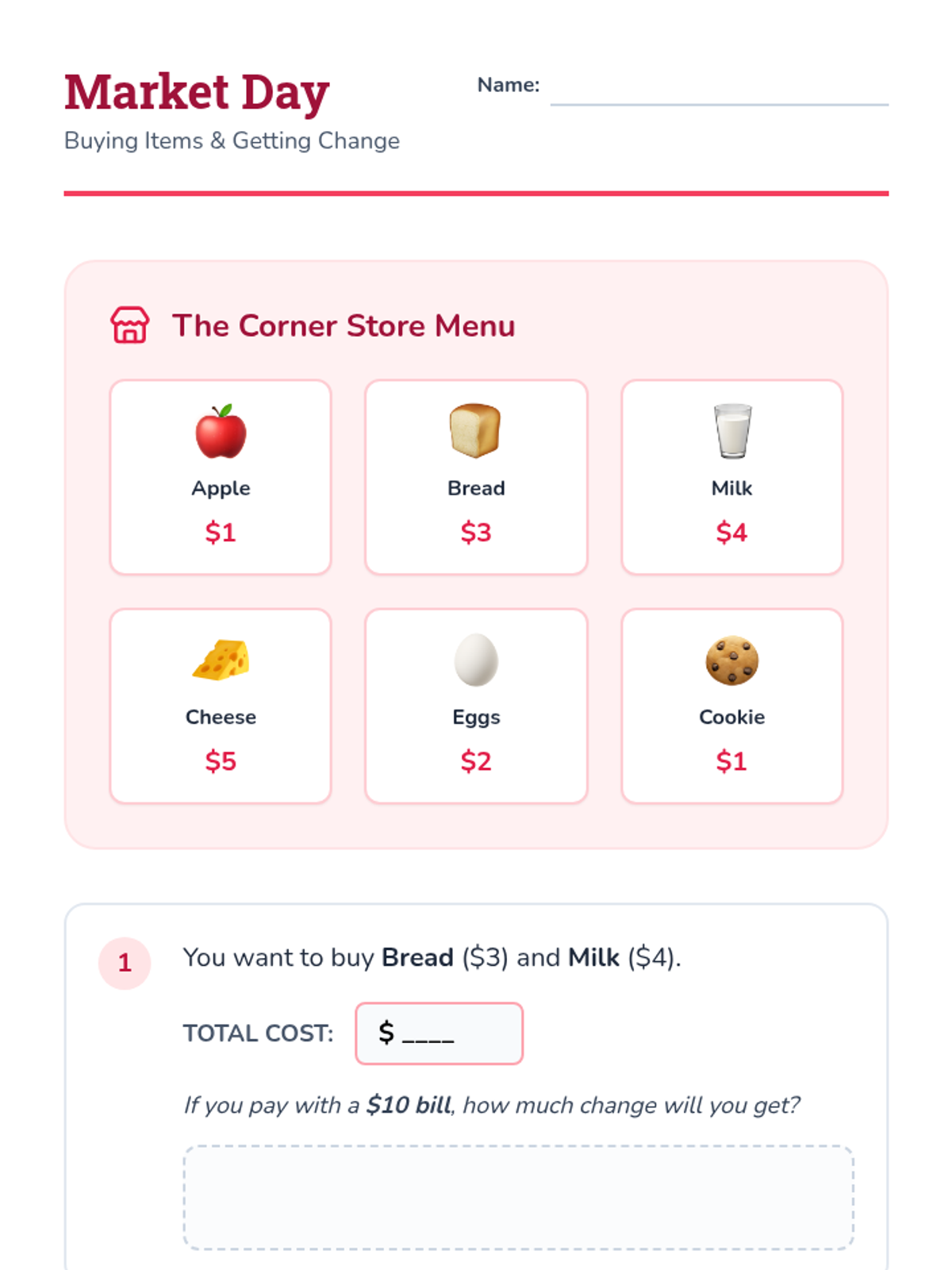 A functional budgeting lesson designed for young adults with intellectual disabilities and autism, focusing on making choices within a fixed budget. Includes a visual shopping worksheet, an answer key, and a guide for substitute teachers.