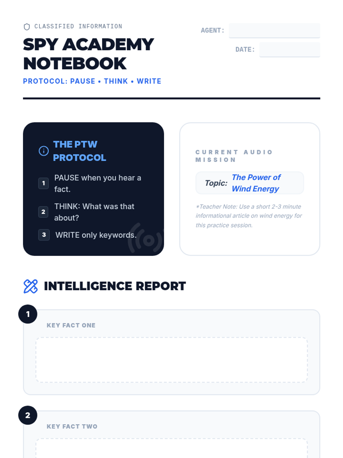 Students practice taking notes while listening to an educational article. They pause the audio to write down key facts, combining listening comprehension with note-taking skills.