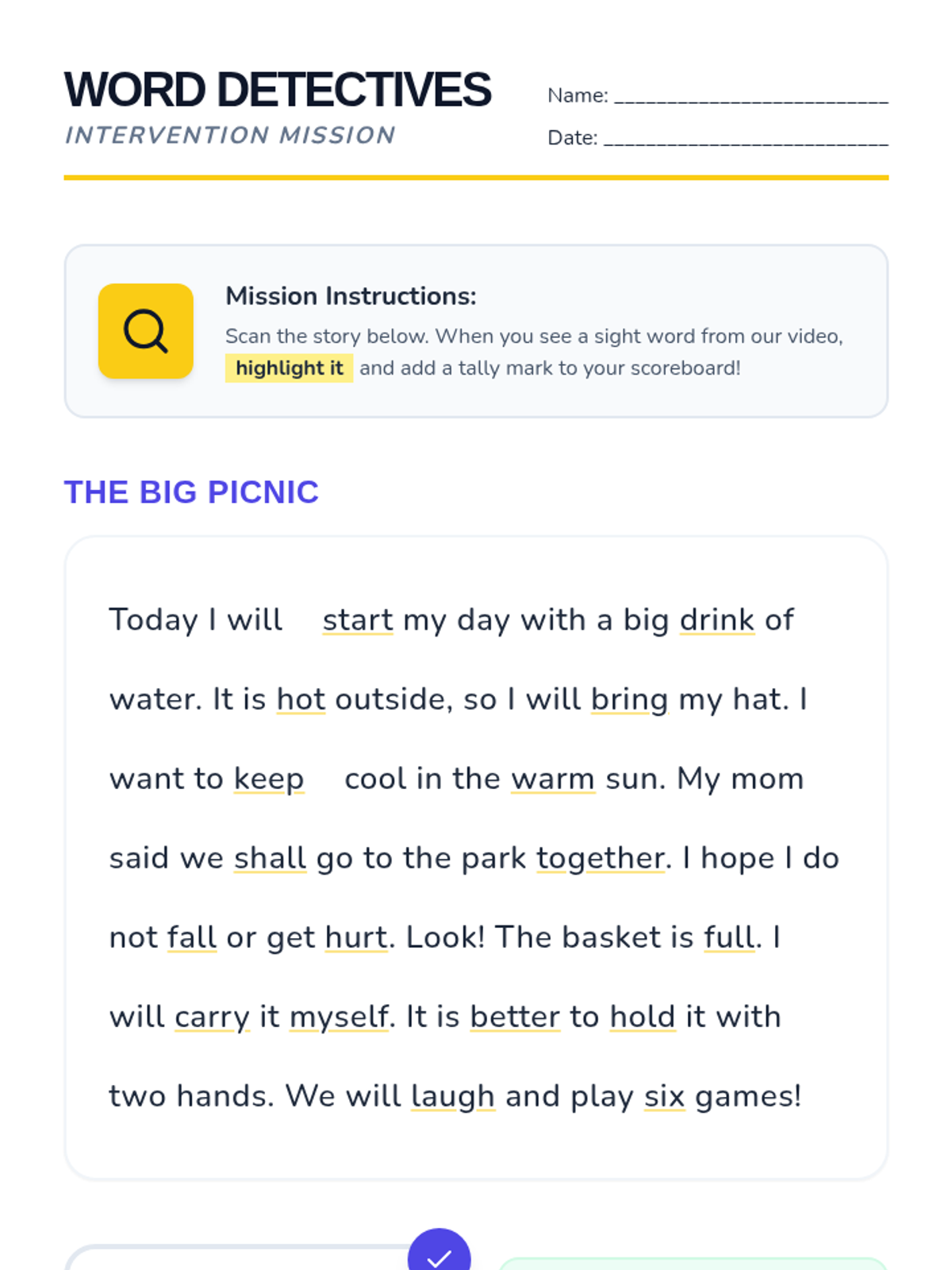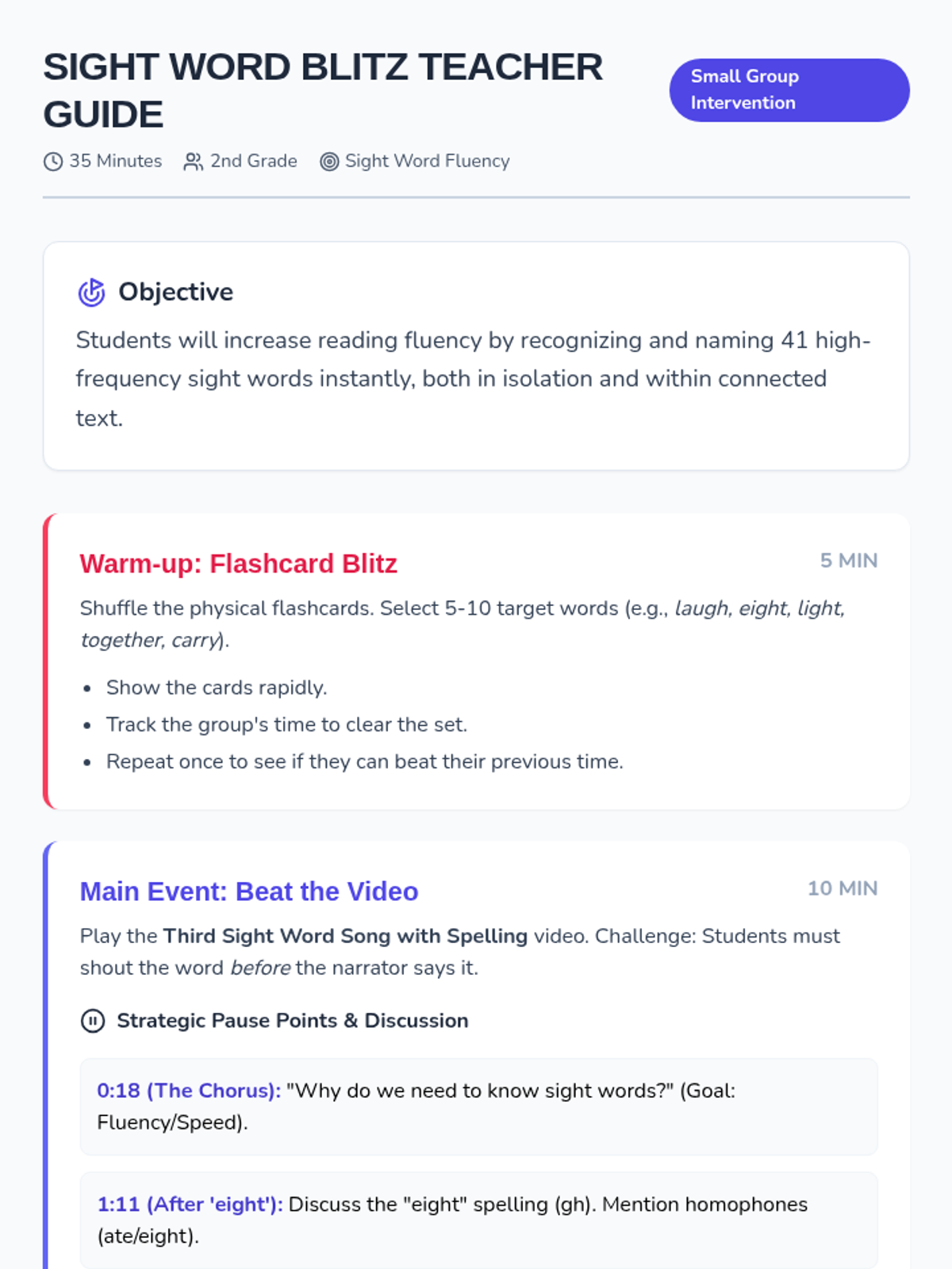 A high-energy small-group intervention focused on sight word recognition and fluency using rhythmic video prompts and detective-style reading activities.