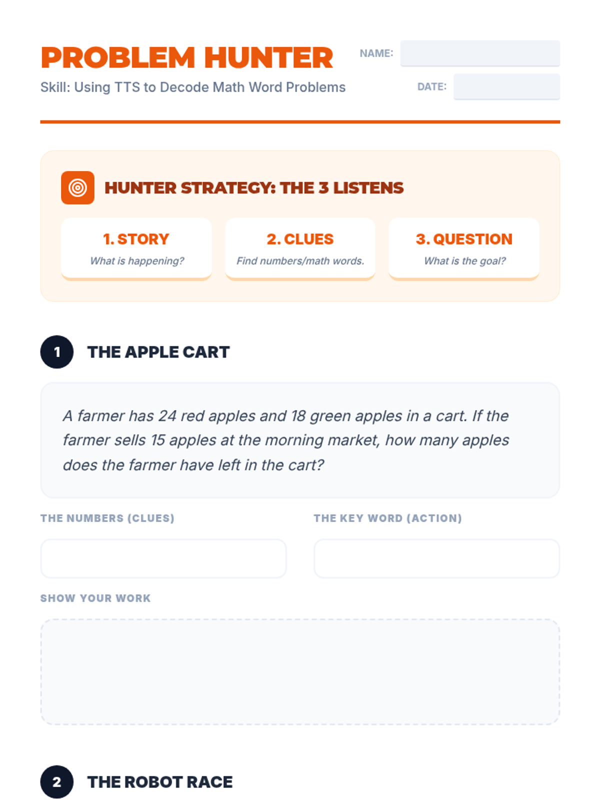 Students apply TTS specifically to math word problems. The lesson focuses on re-listening to identify the numbers and the question being asked without getting overwhelmed by the text.
