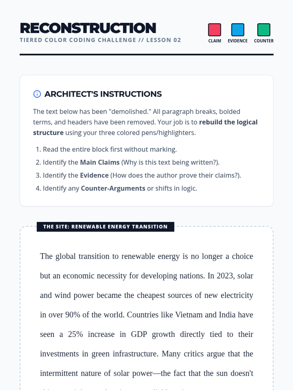 Students practice a three-color system to distinguish claims, evidence, and counter-arguments in a text.