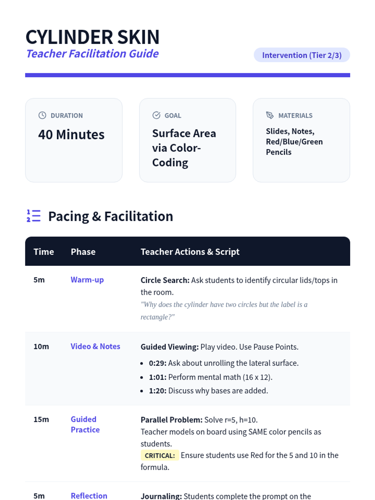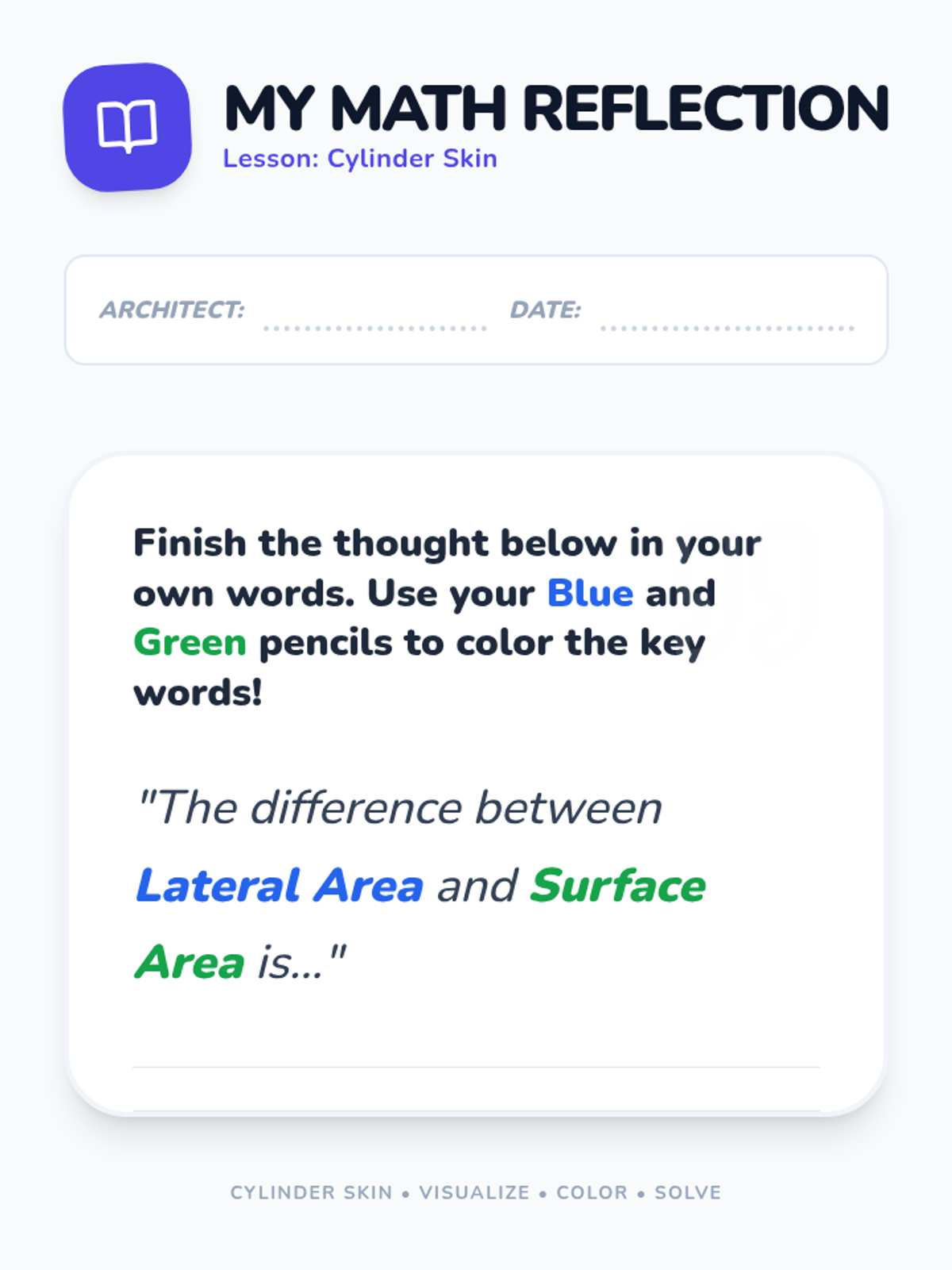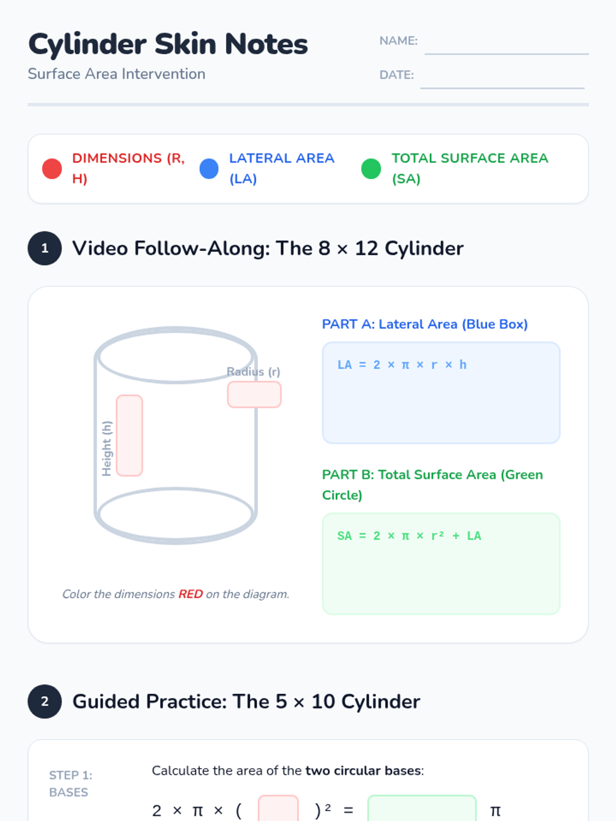 A specialized intervention lesson for 8th-10th grade students to master cylinder surface area using color-coding strategies and step-by-step video modeling. Students use specific colors to distinguish between dimensions, lateral area, and total surface area.