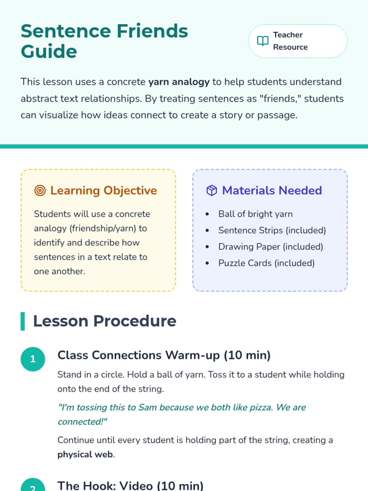 A concrete, tactile lesson designed for special education students to understand how sentences in a text relate to one another using the analogy of friendship and a physical yarn web.