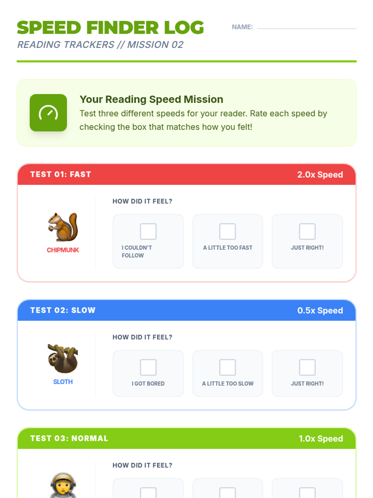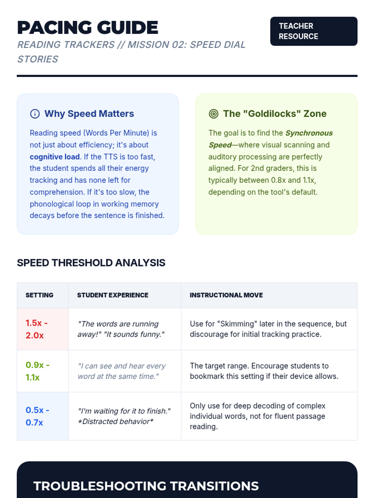Learners experiment with different speech rates to find their 'Goldilocks' speed—not too fast, not too slow—for effective multimodal reading.