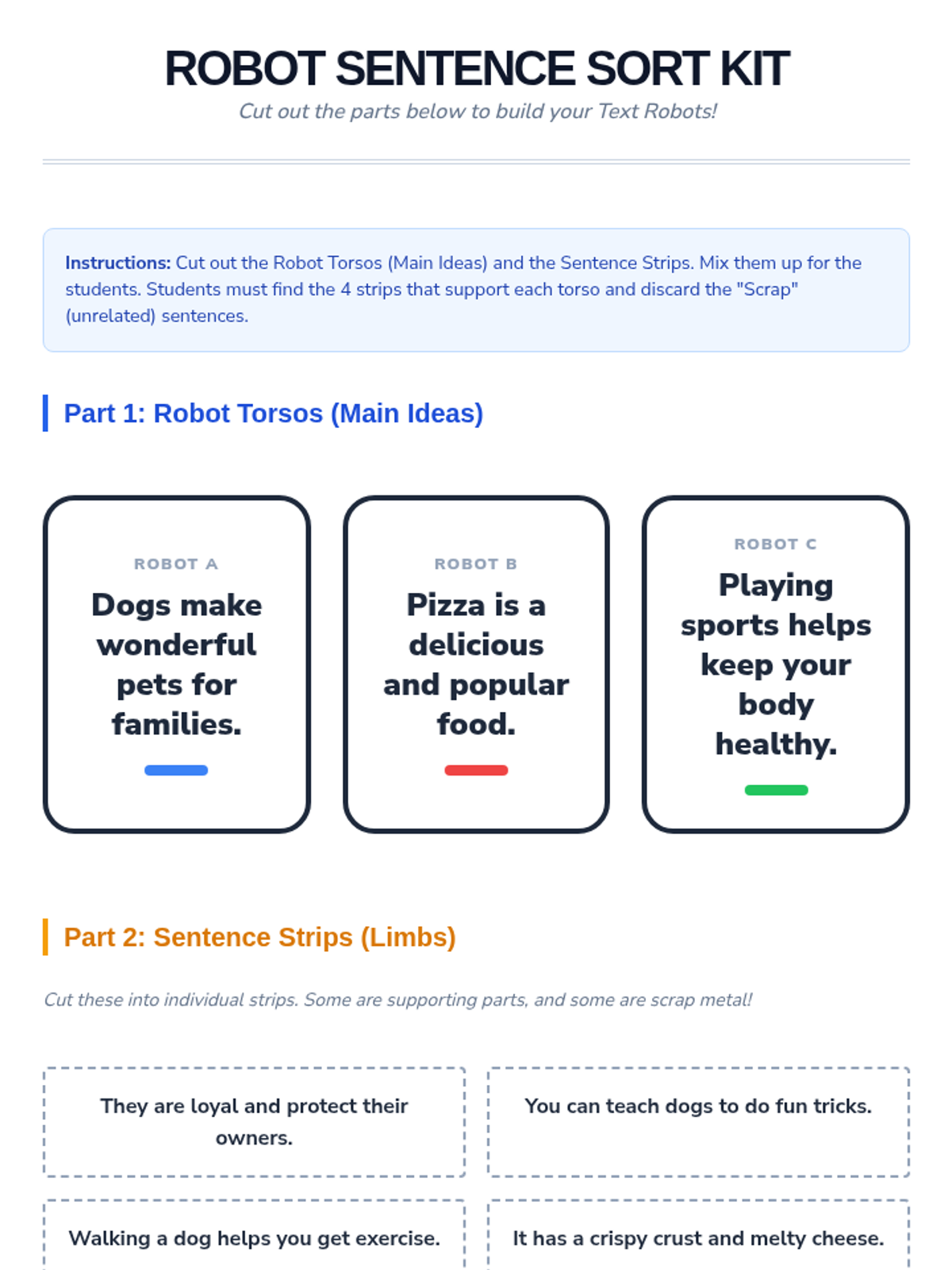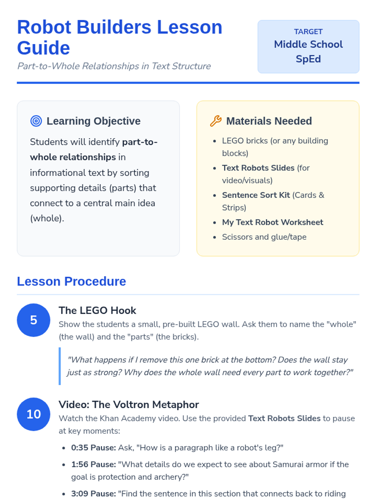 A small-group special education lesson focused on identifying part-to-whole relationships in text structure using a robot metaphor and hands-on manipulatives. Students will build 'text robots' by sorting supporting details that connect to a main idea.