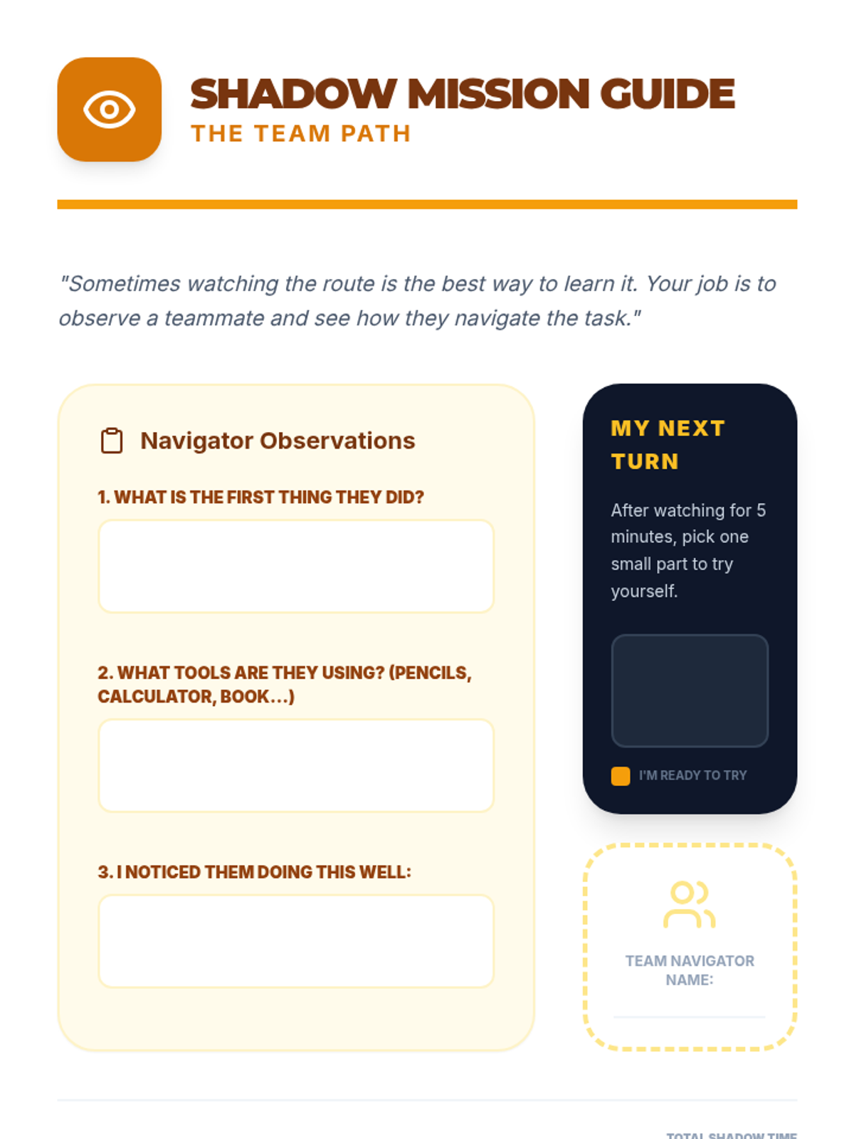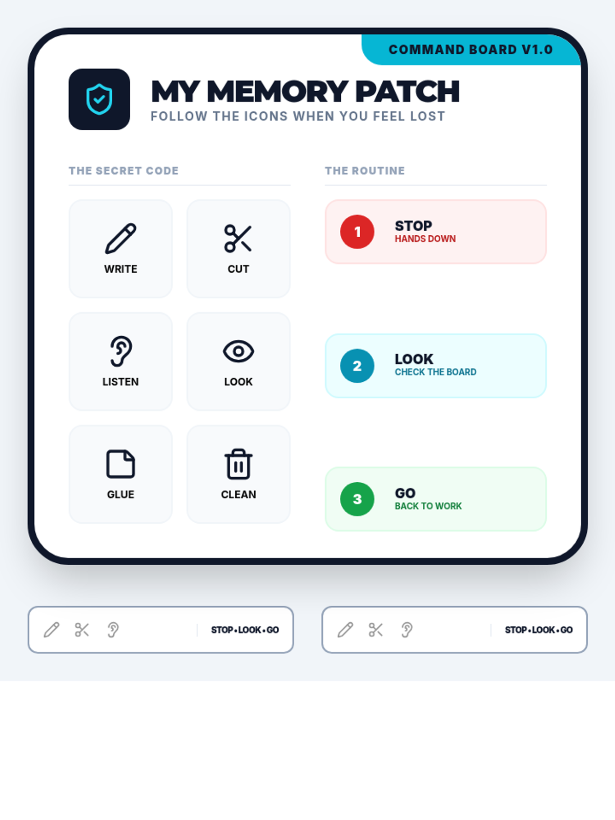 Students practice a physical routine where they stop their work and look at a visual reference board whenever they feel lost. This builds the habit of referencing external aids rather than guessing.
