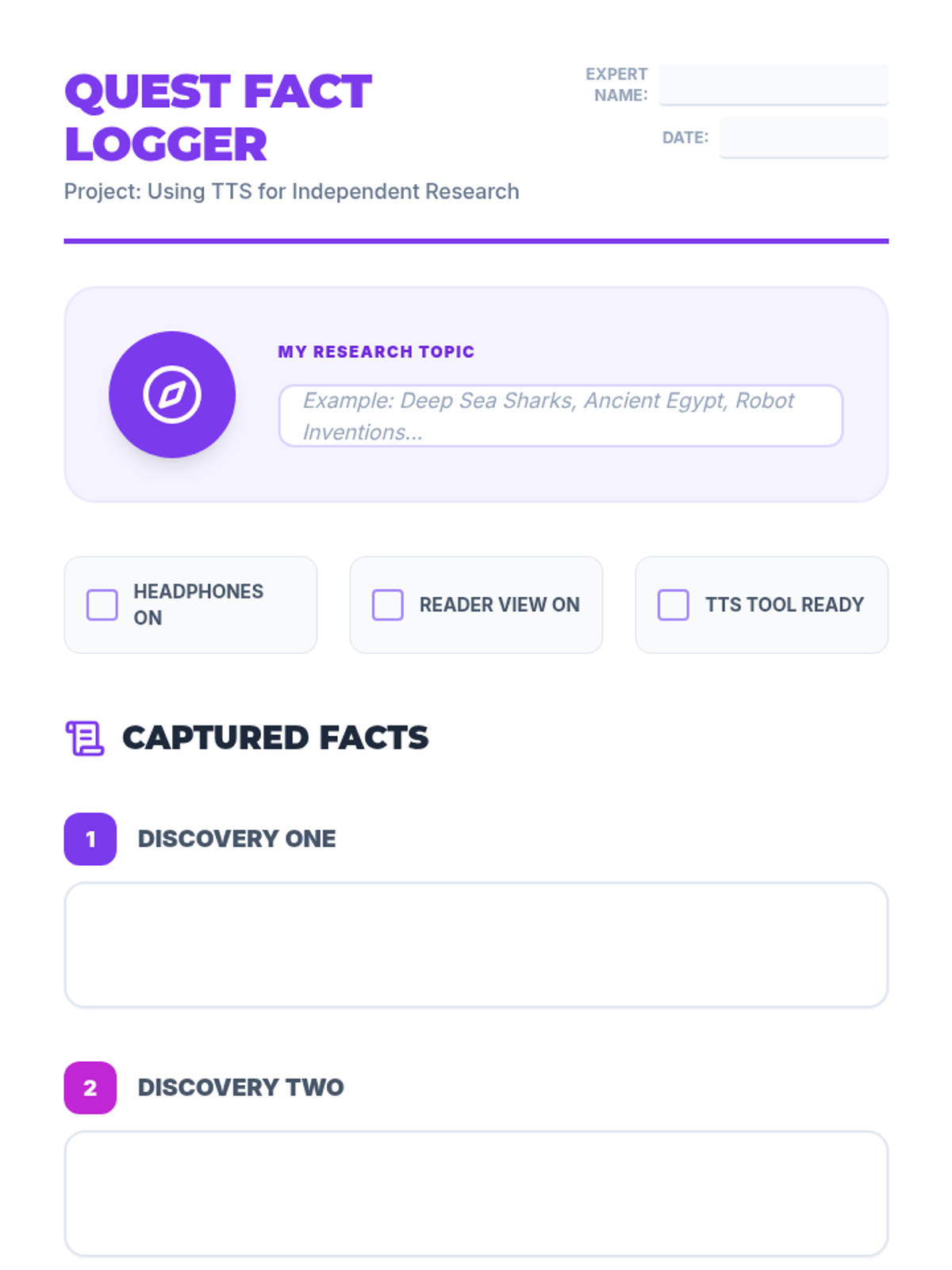 Students conduct a mini-research project on a topic of interest using TTS to access articles that might be above their independent reading level. They practice gathering facts via audio.