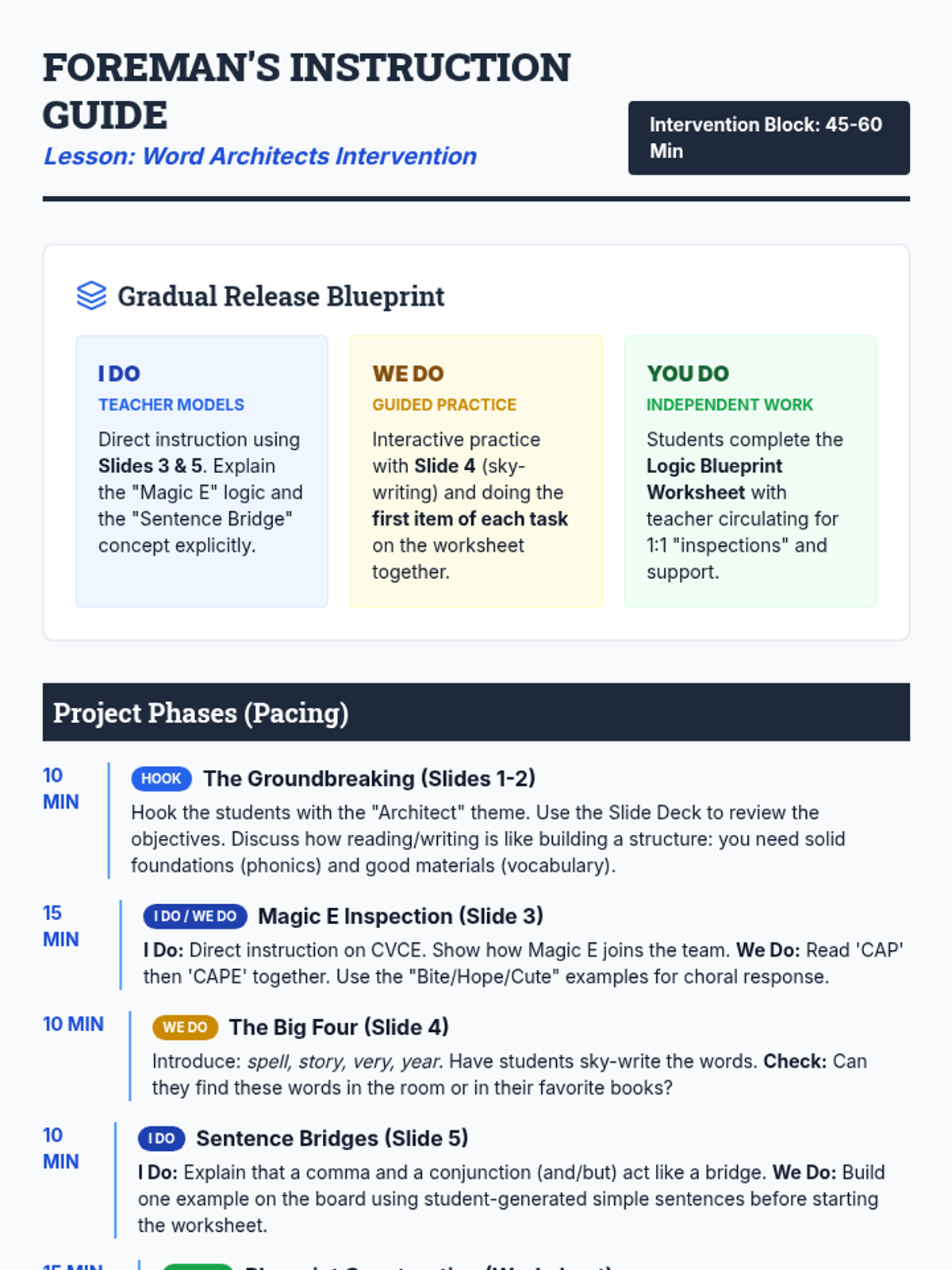 A literacy intervention lesson for middle school students reading at a 2nd-grade level, focusing on CVCE words, high-frequency words, and sentence structure with an architectural theme.