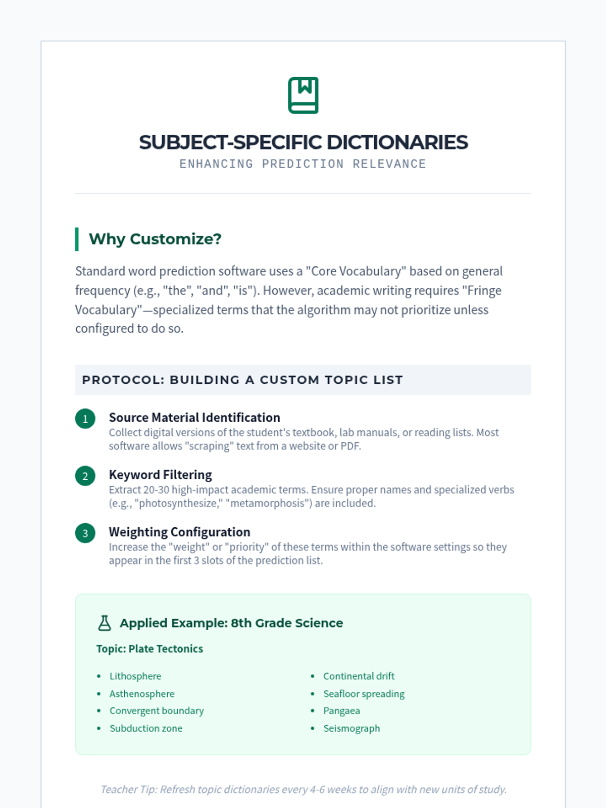 Investigate the logic of word prediction and text expansion tools. Learn to configure phonetic vs. frequency-based prediction and customize dictionaries for specific learner needs.