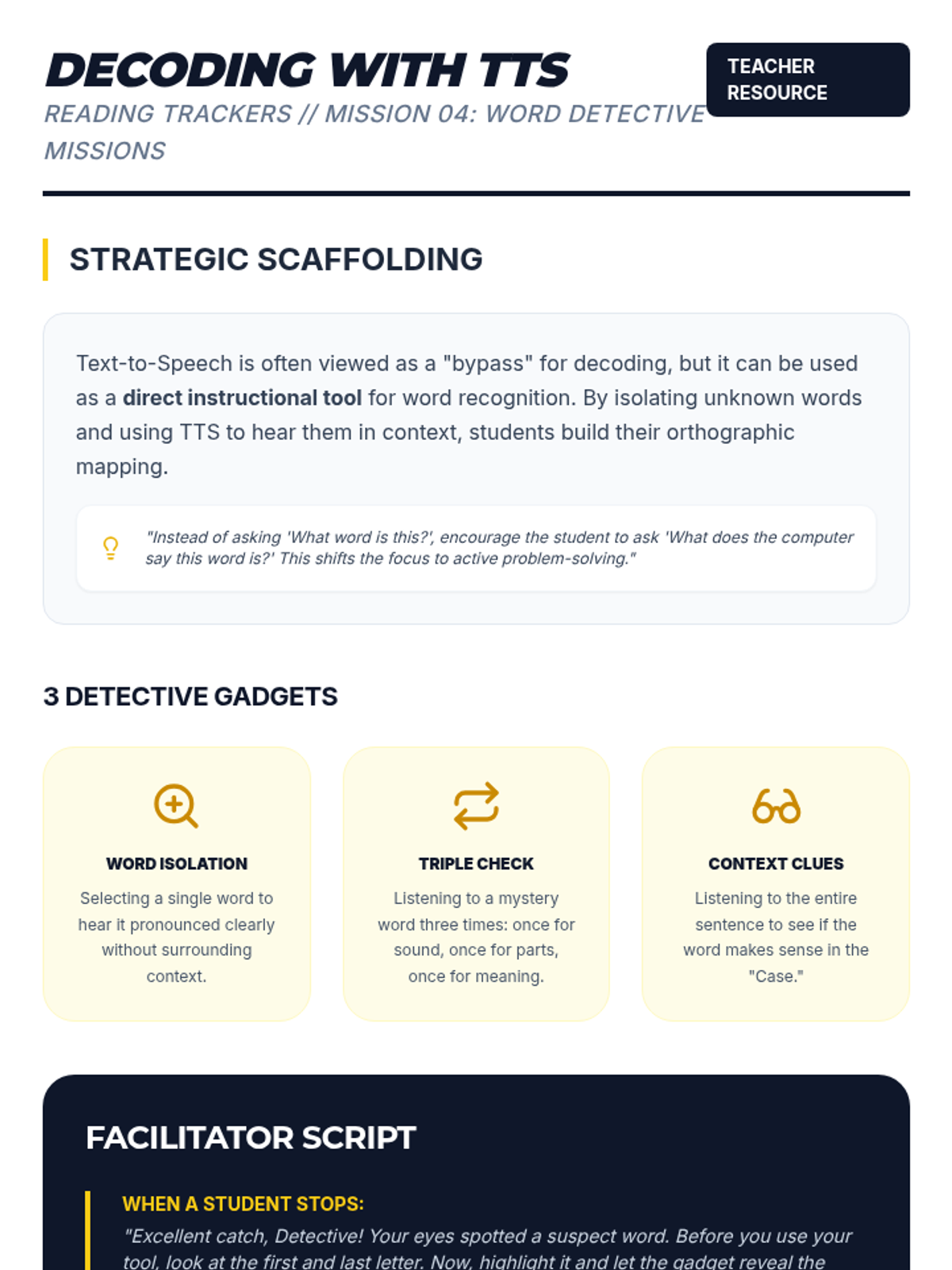 Students learn to use TTS to identify and decode unfamiliar words, acting as 'Word Detectives' to solve mysteries in the text.