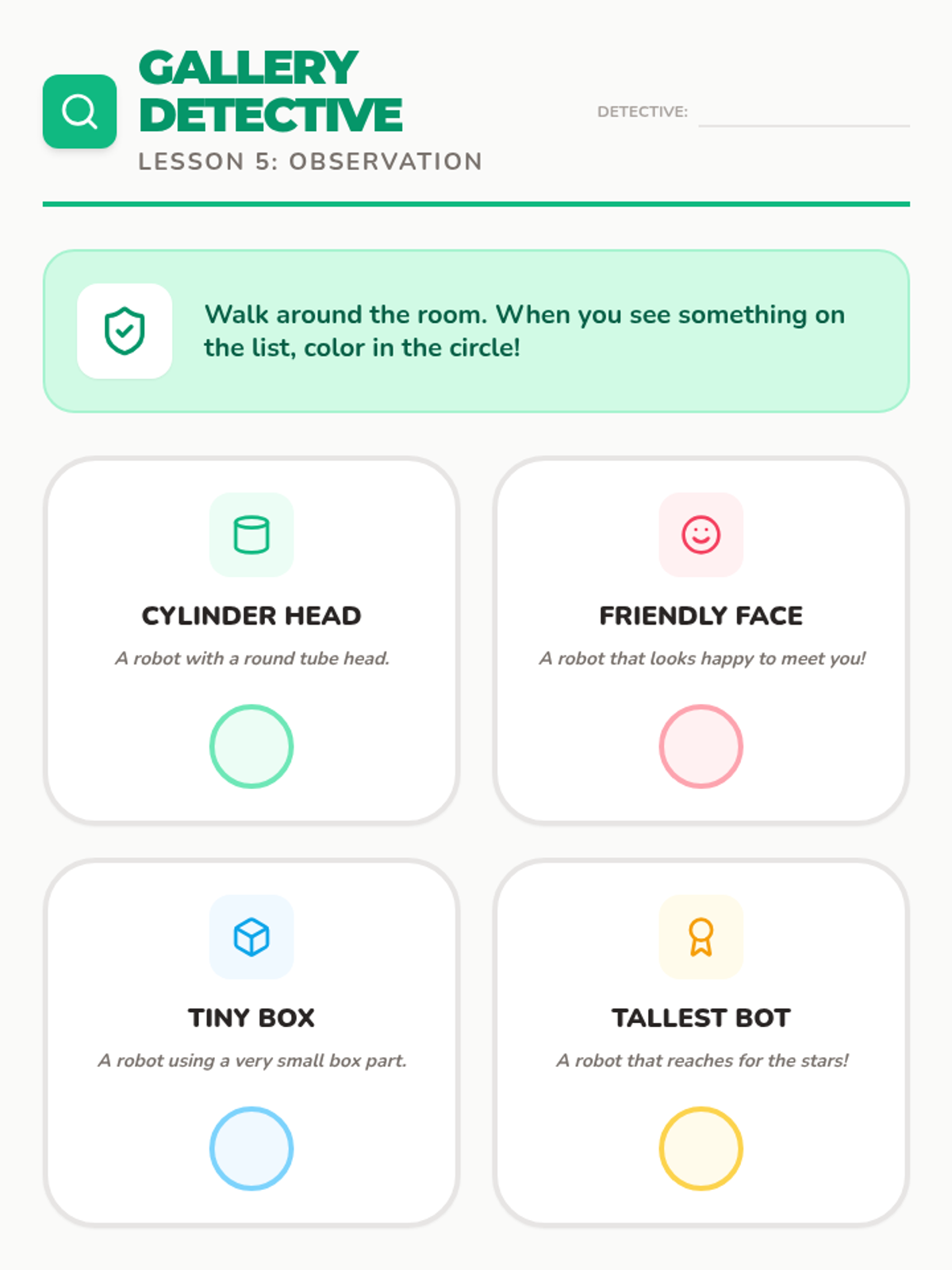 Students display their assemblages in a classroom 'museum' and practice 360-degree observation and art critique.