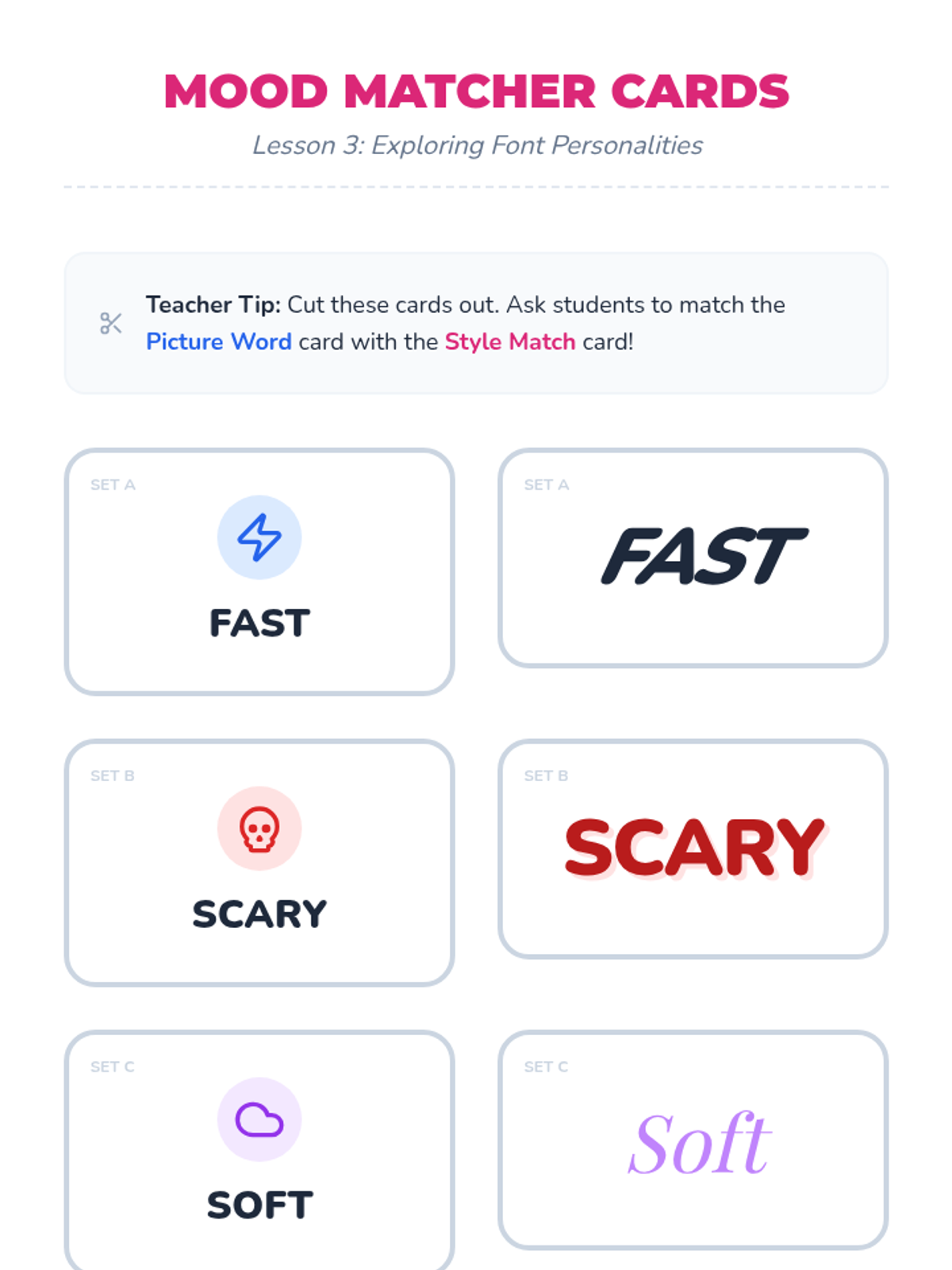 A fun exploration of how fonts convey mood and meaning. Students match descriptive words to appropriate font styles and discuss why certain shapes feel 'fast', 'slow', or 'scary'.