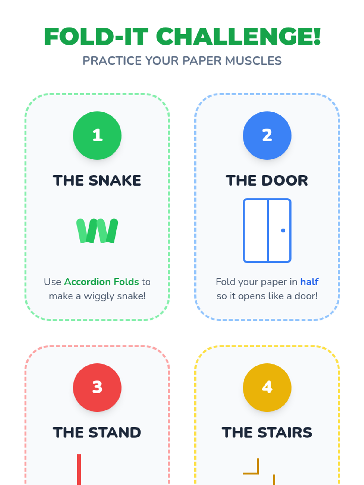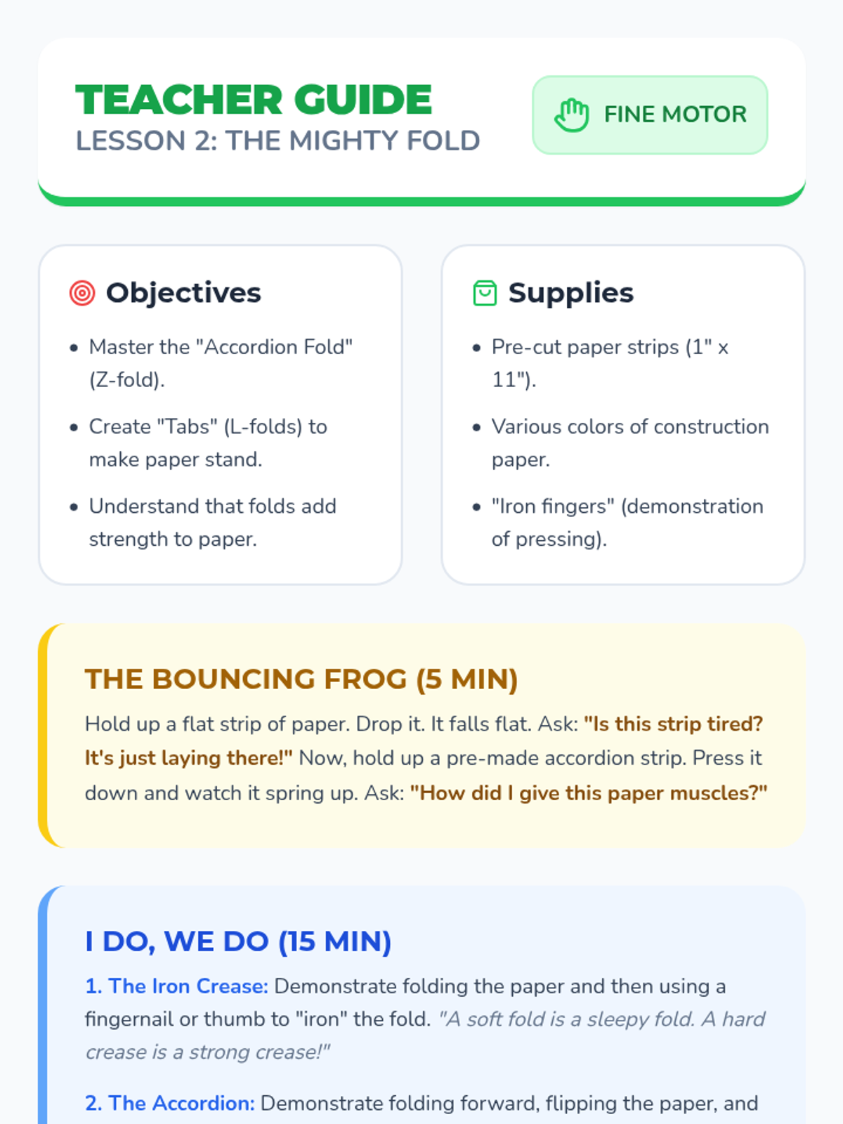 A hands-on workshop where students learn to create structural integrity in paper through accordion and tab folds. This lesson focuses on making sharp creases to turn limp paper into rigid building blocks.