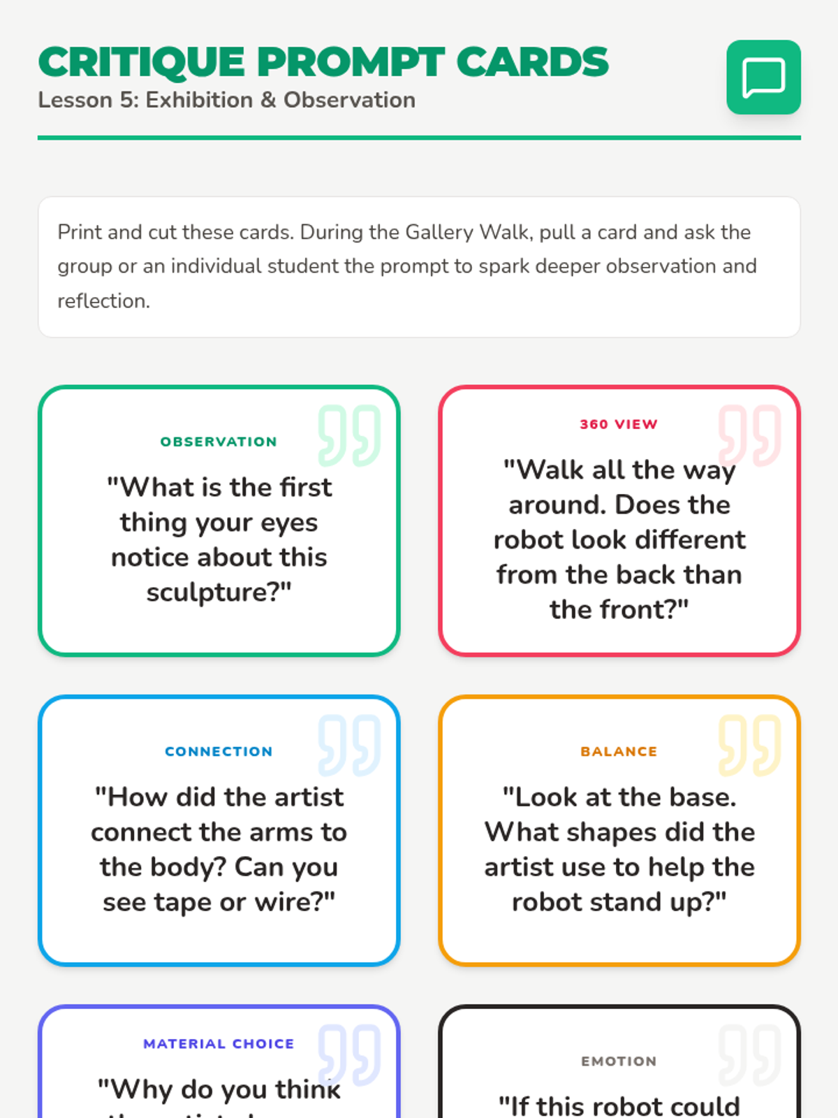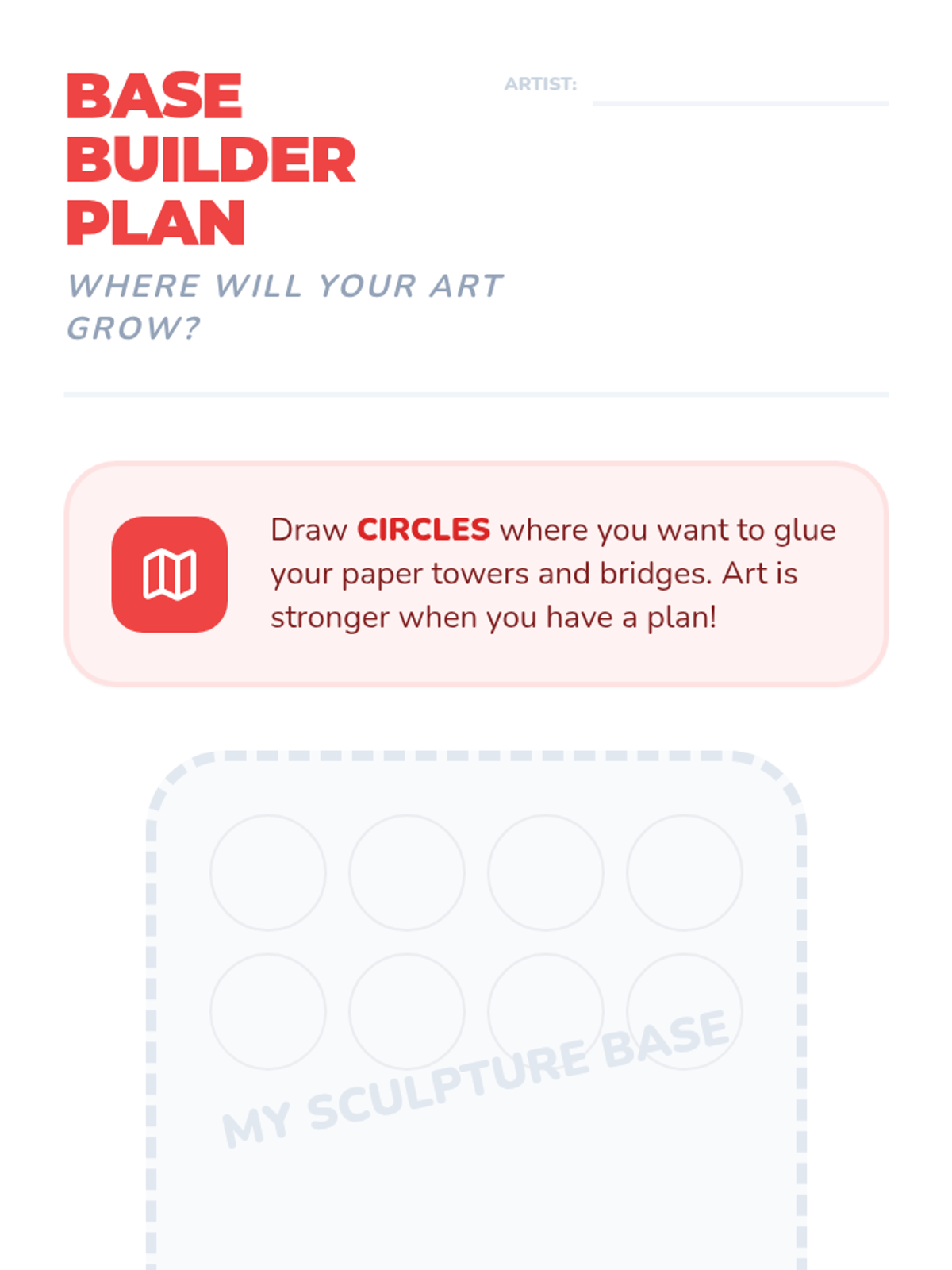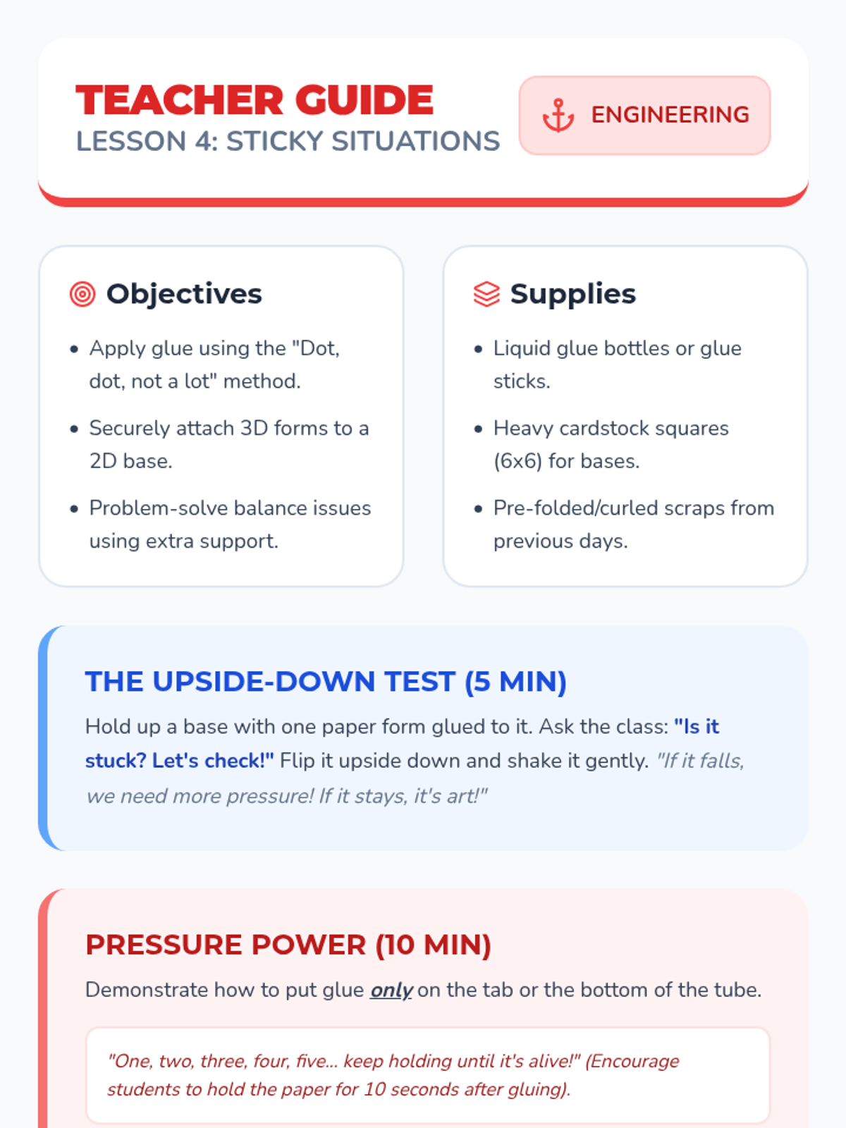 This lesson focuses on the engineering of sculpture, teaching students how to adhere 3D components to a base and achieve balance. Students learn the 'upside-down test' for structural stability.