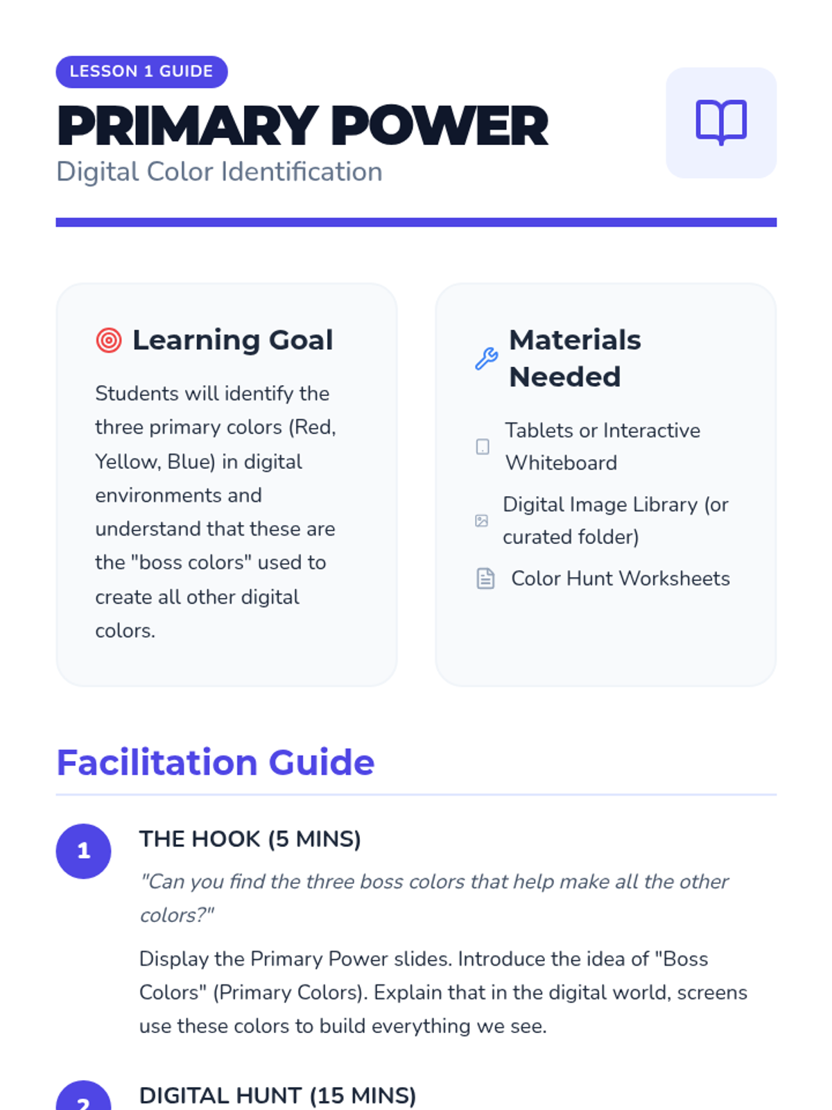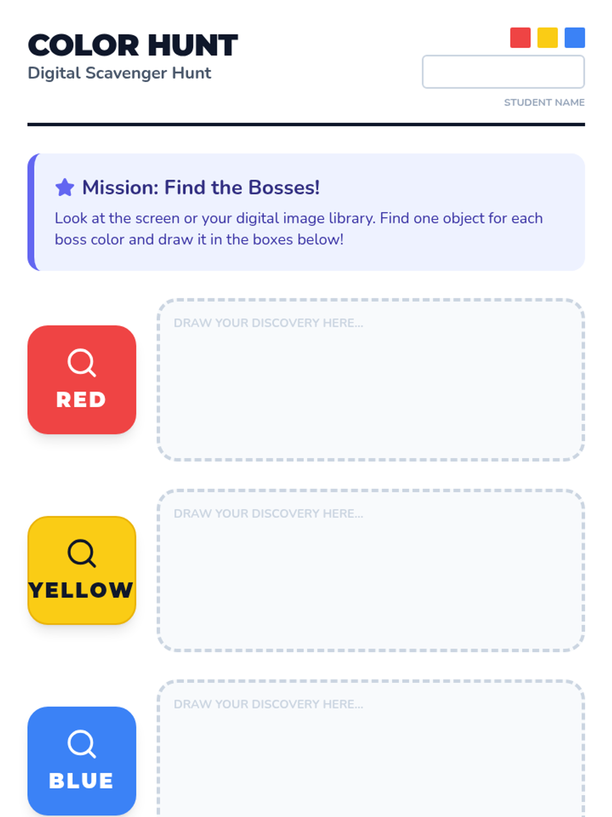 Students identify red, yellow, and blue on a digital color wheel and engage in a digital scavenger hunt to find objects of these colors.