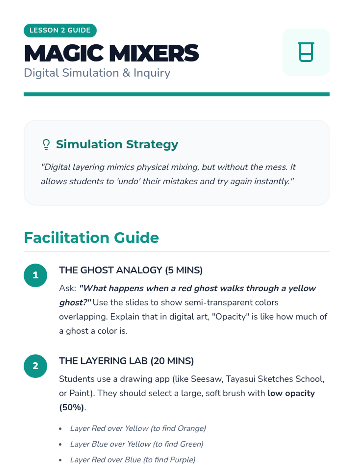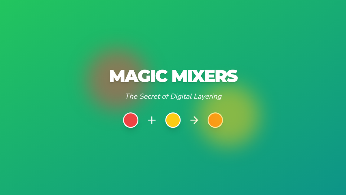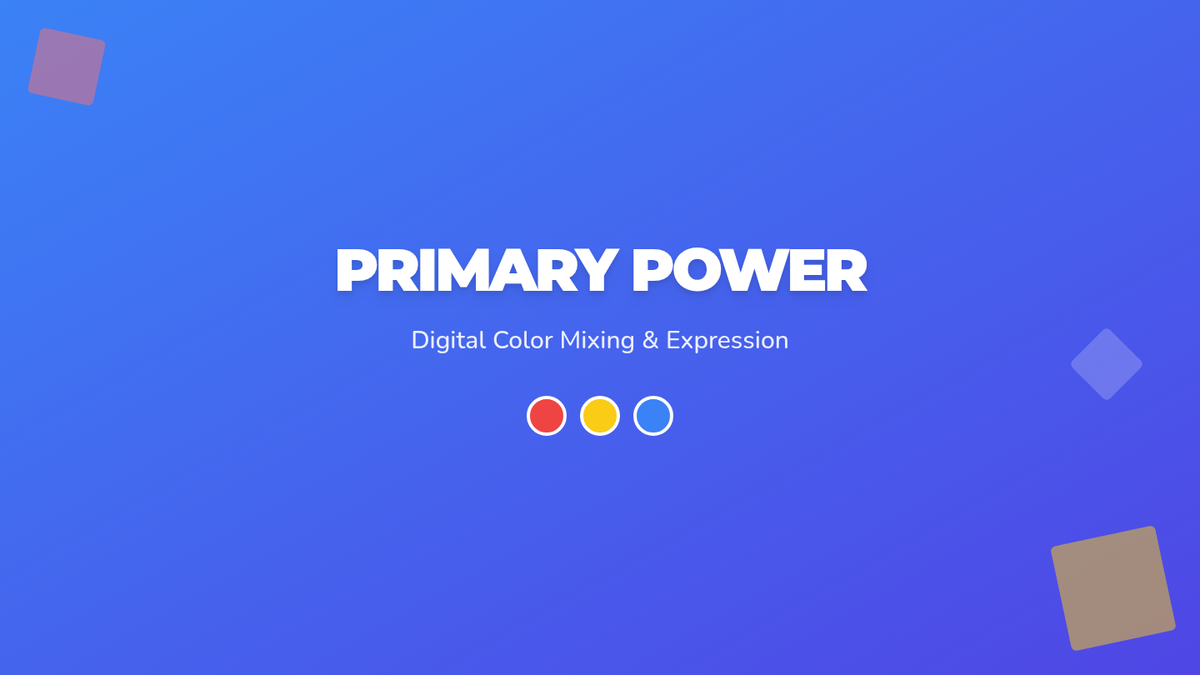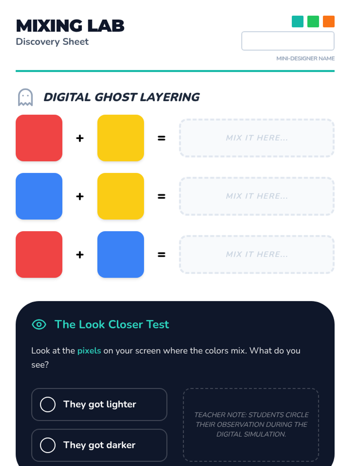 Students layer primary colors digitally to discover secondary colors (orange, green, purple) and observe digital layering.