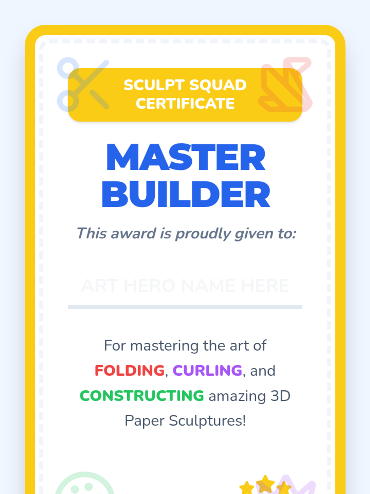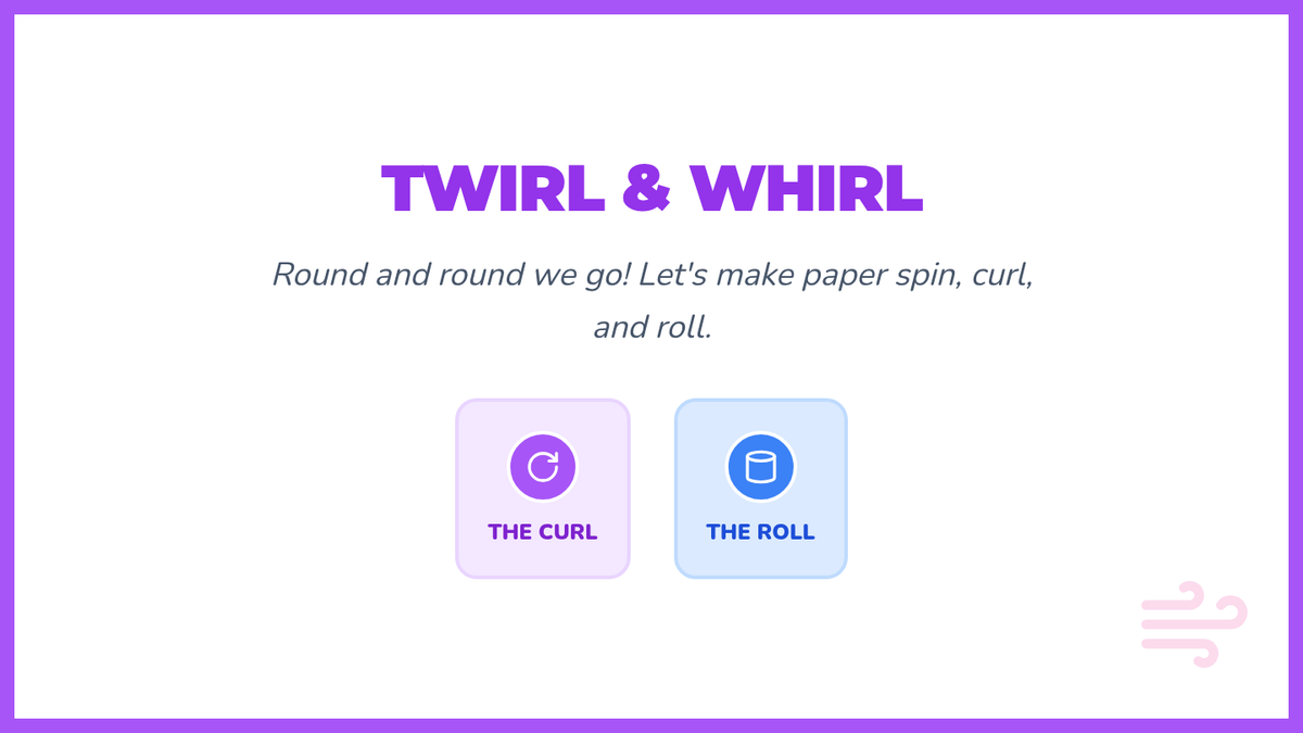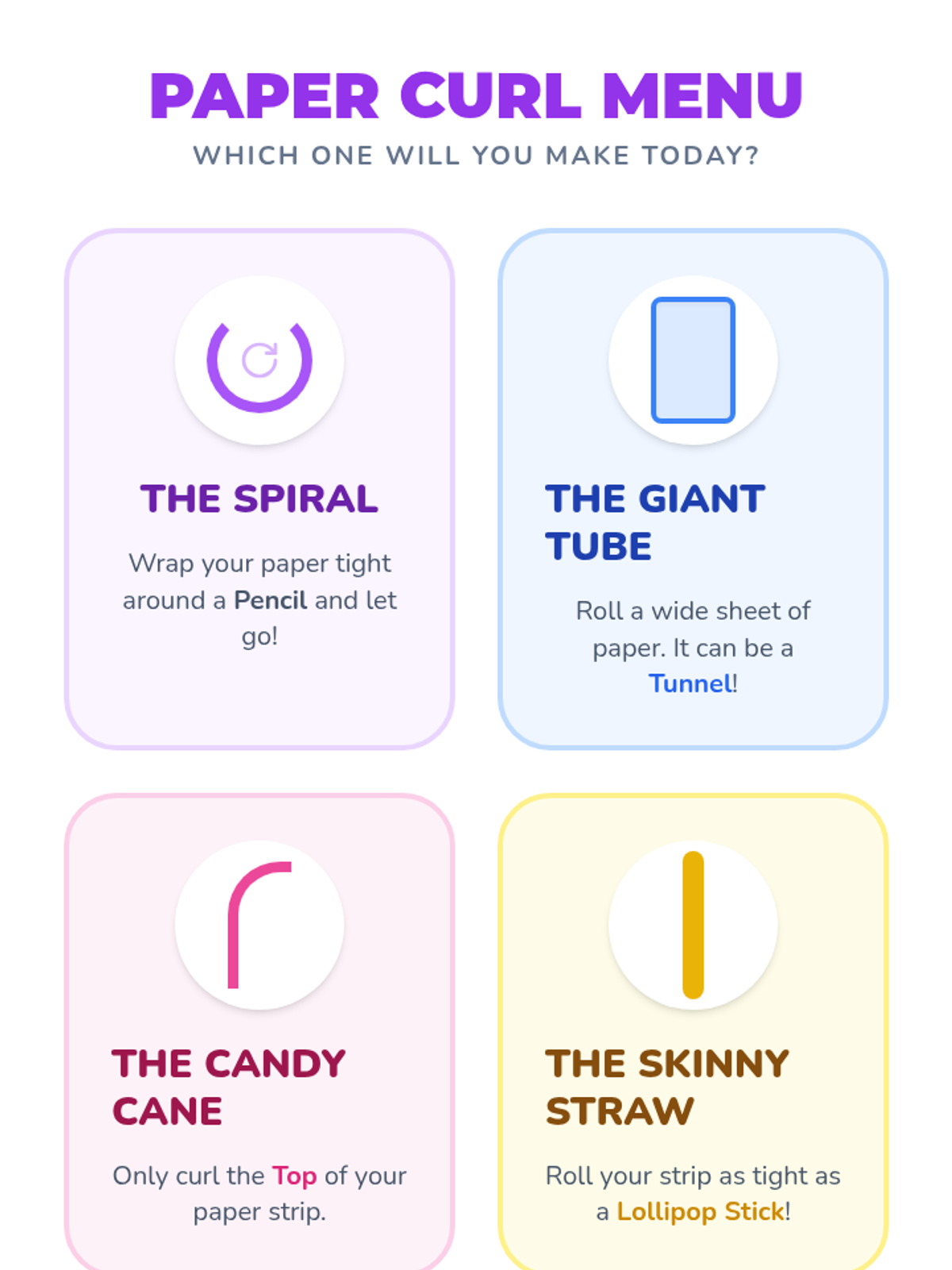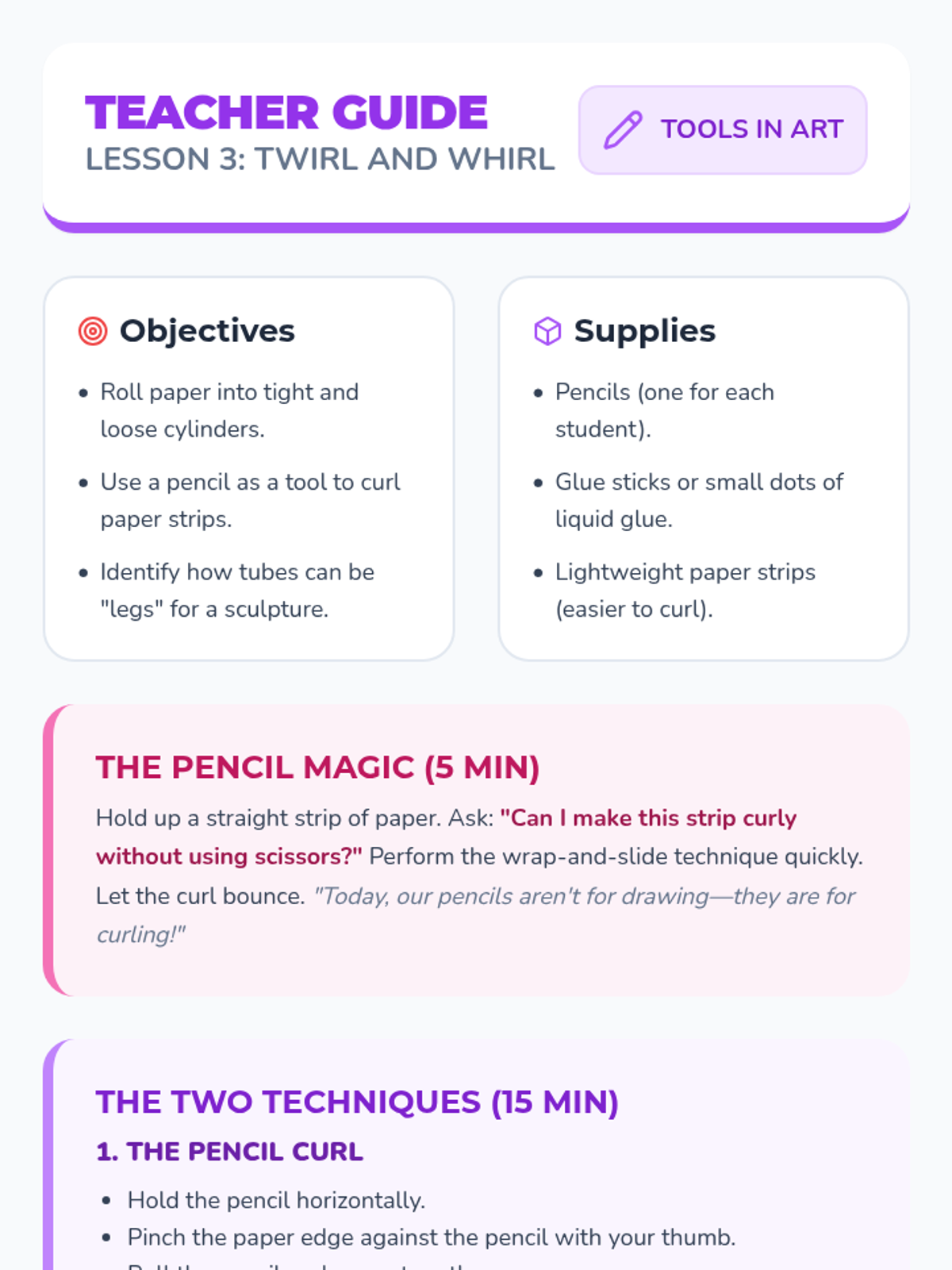 Students expand their sculptural toolkit by learning to roll tubes and curl paper around pencils. These techniques introduce cylindrical forms and decorative volume to their paper constructions.
