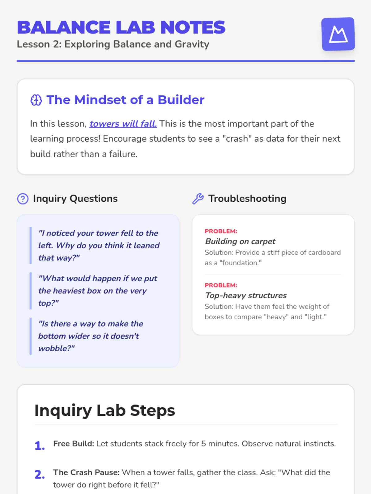 Students experiment with stacking objects to understand weight distribution and gravity, discovering which shapes make effective bases.
