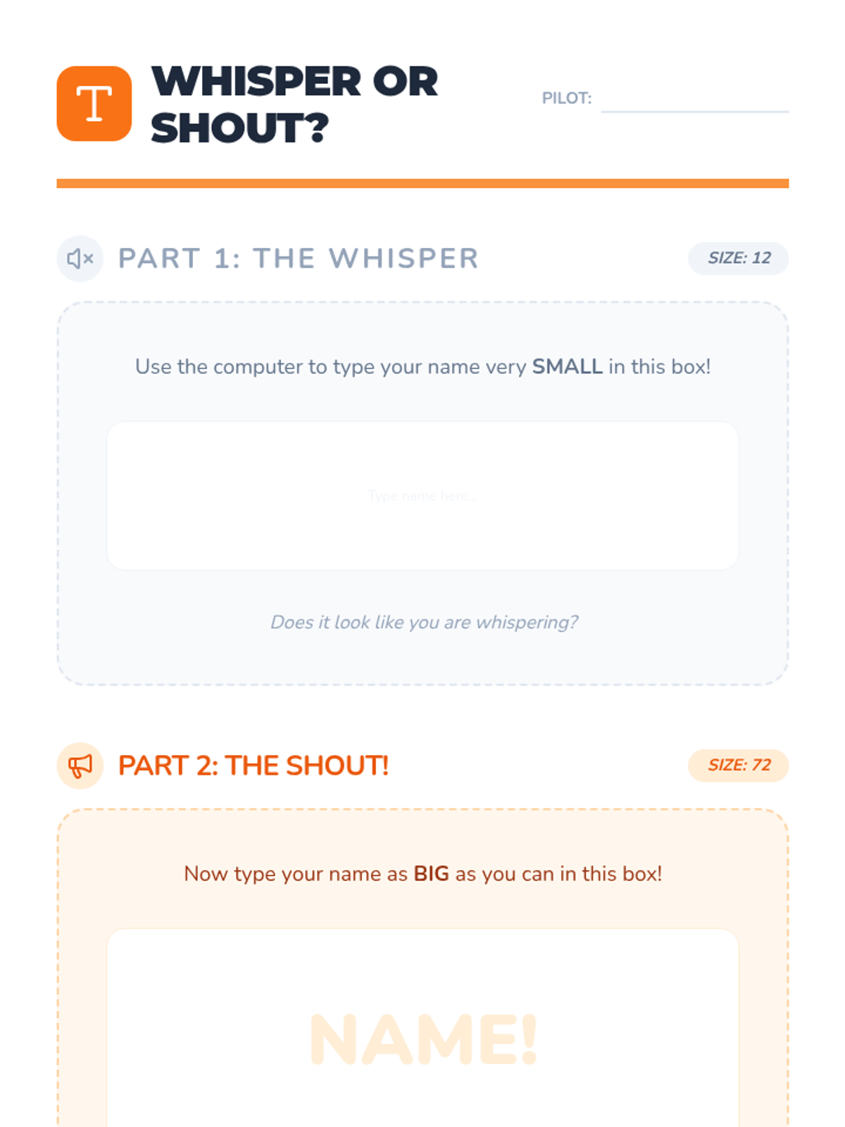 An introduction to using text tools in a digital environment. Students learn to type their names and manipulate size to make words 'whisper' (small) or 'shout' (large).