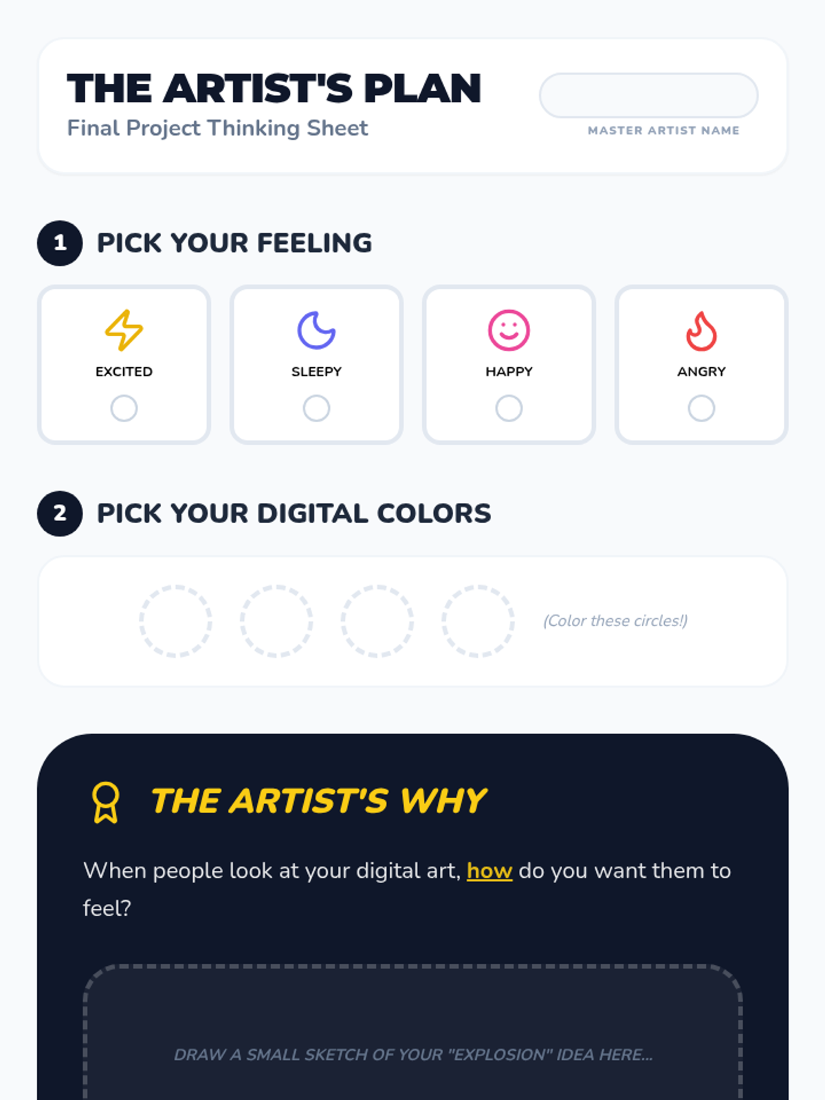 A culminating project where students combine shapes, colors, and text to create a planned digital scene.