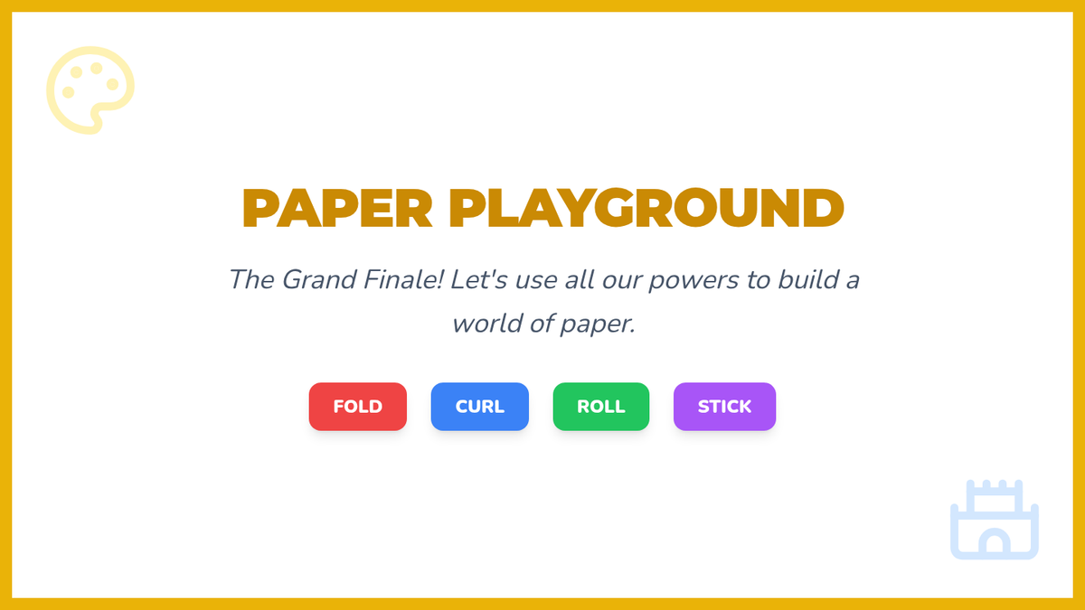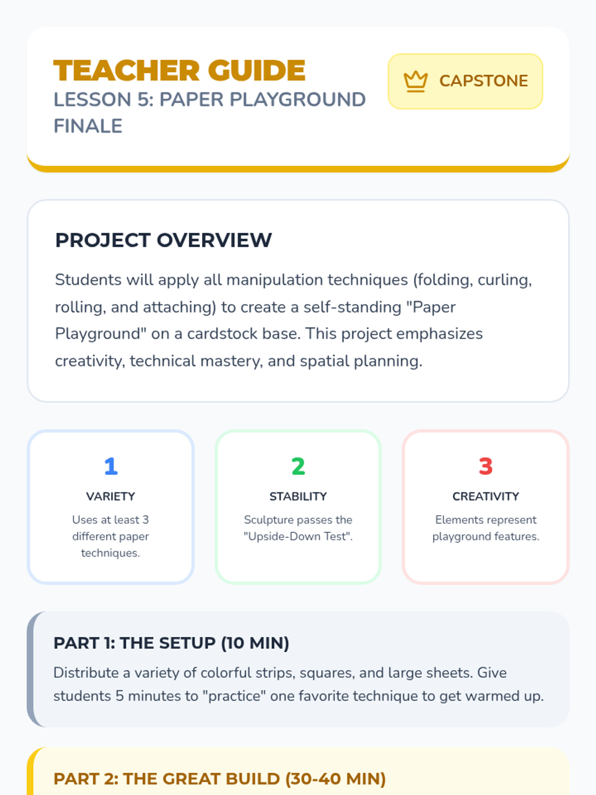 In the final project-based lesson, students synthesize all learned techniques to design and build a 'Paper Playground'. They apply their skills to create slides, tunnels, and ladders in a free-standing sculpture.
