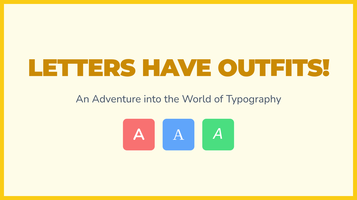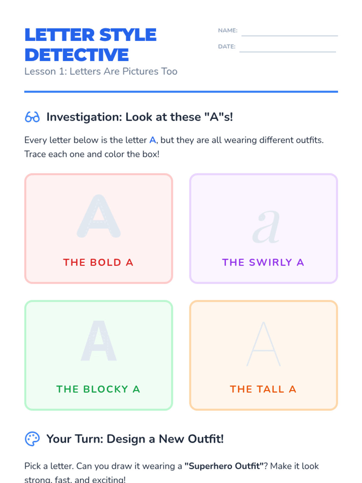 Students explore the idea that letters are made of shapes and lines and can wear different 'outfits' (fonts). They will observe bold, script, and blocky styles to see how the look of a letter changes.
