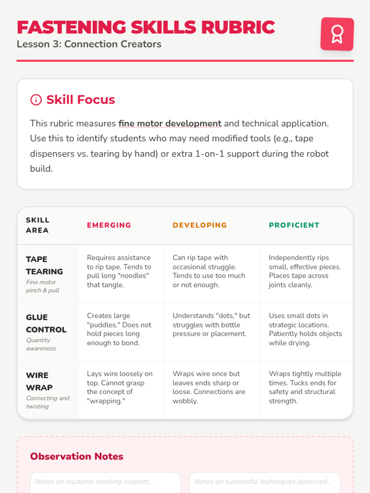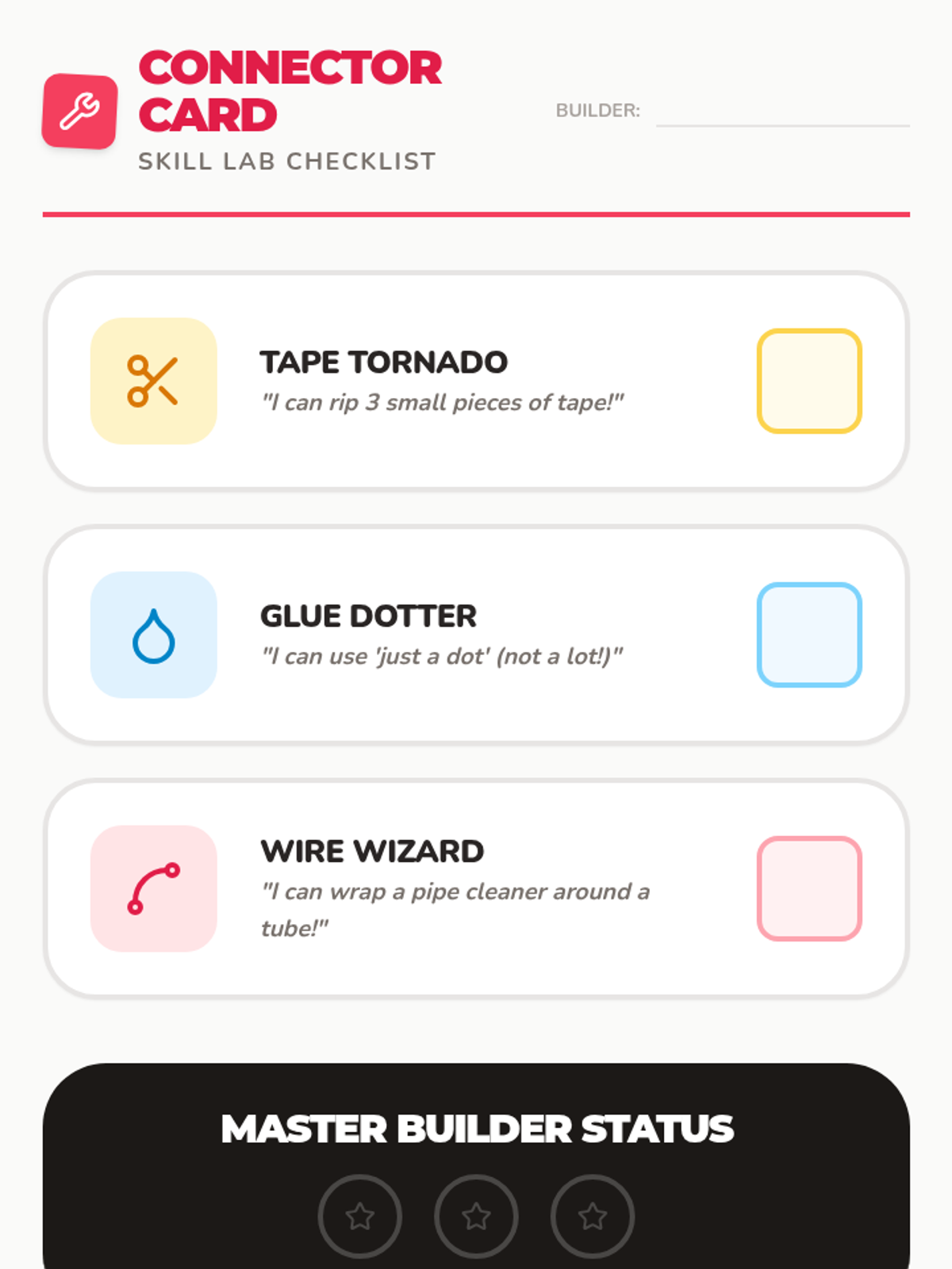 Students learn how to use tape, pipe cleaners, and other connectors to join distinct objects together securely.