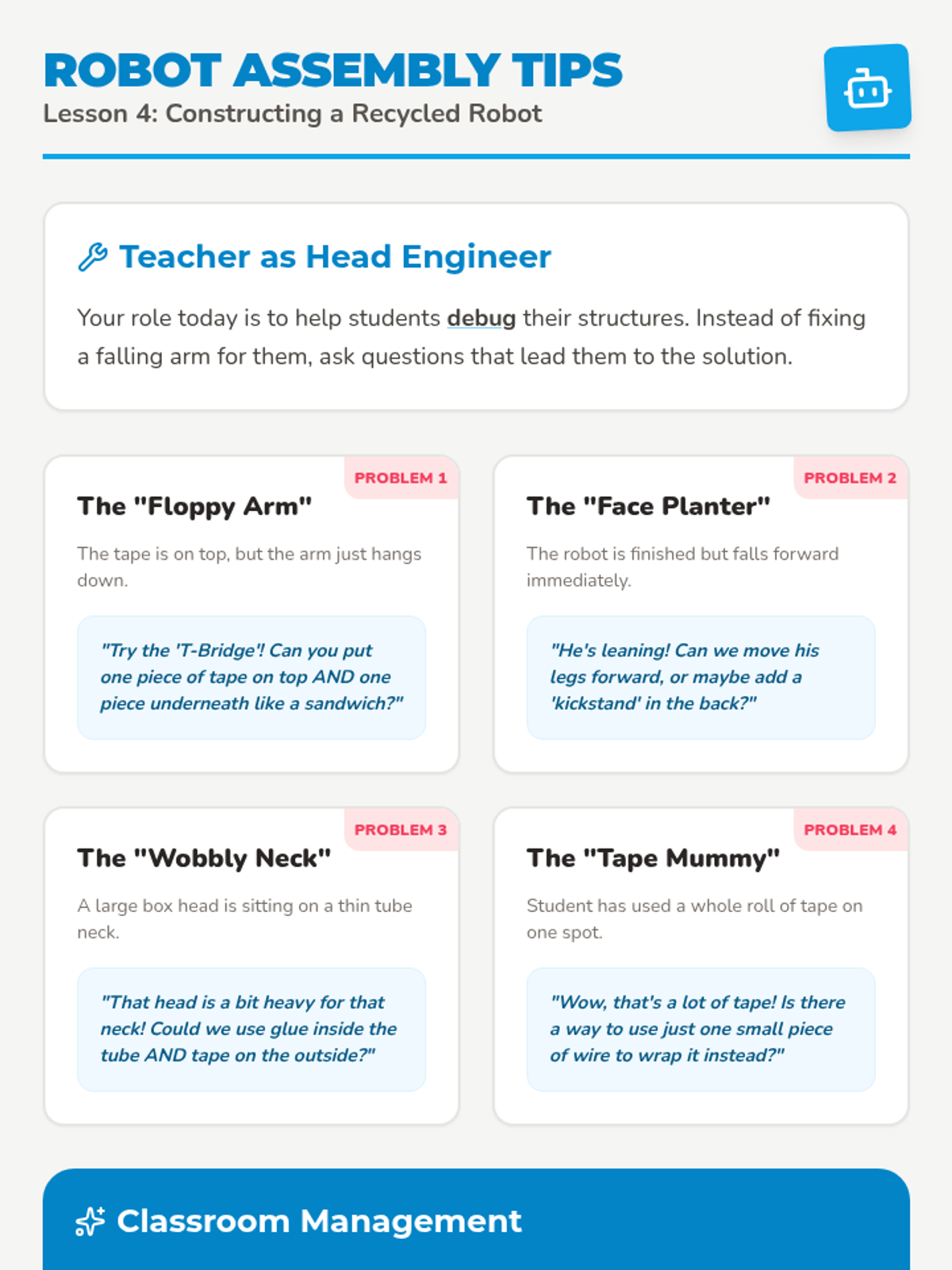 Applying knowledge of balance and fastening, students construct a recycled robot, solving structural problems to ensure it stands.