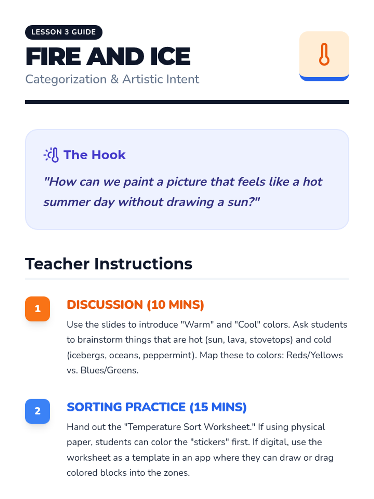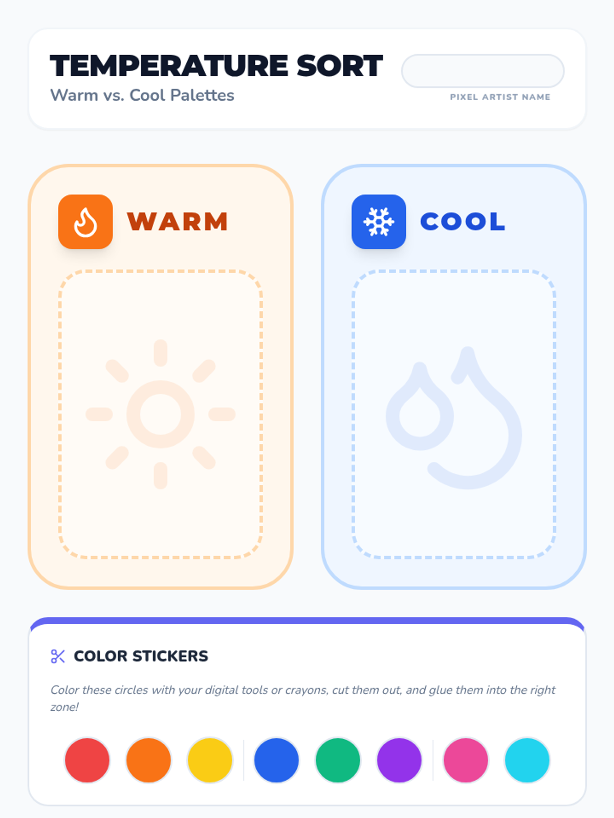 Students explore temperature through color, creating scenes with warm and cool digital palettes.