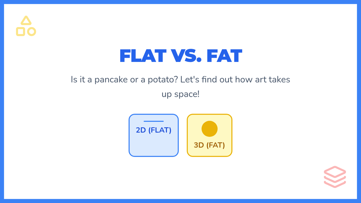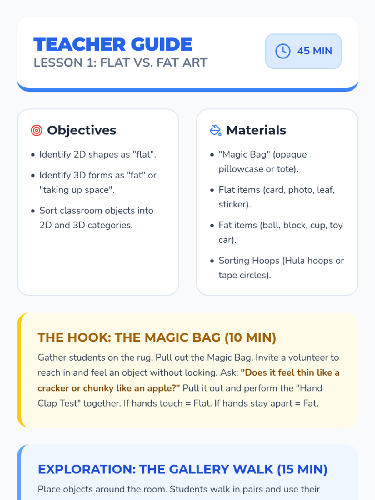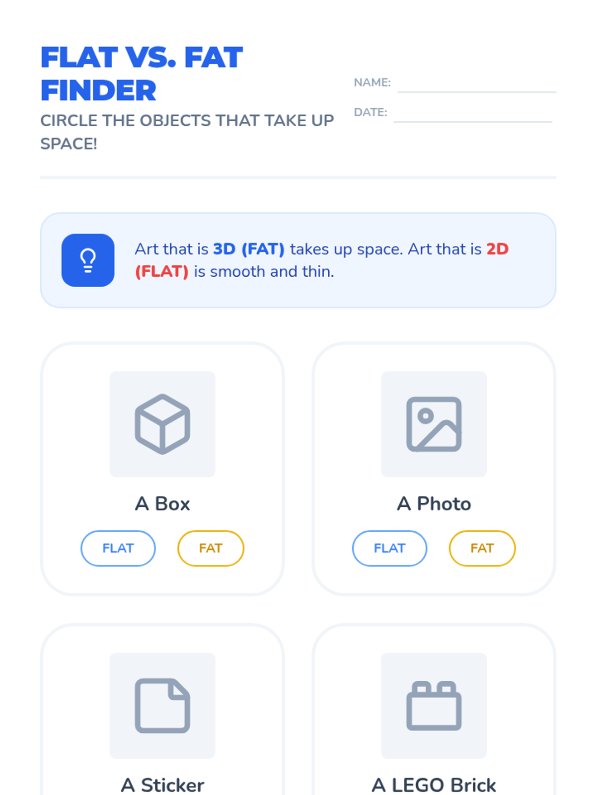 Students explore the difference between flat shapes and three-dimensional forms through tactile observation and sorting. They build foundational vocabulary like 'flat' and 'fat' to distinguish between 2D and 3D art.