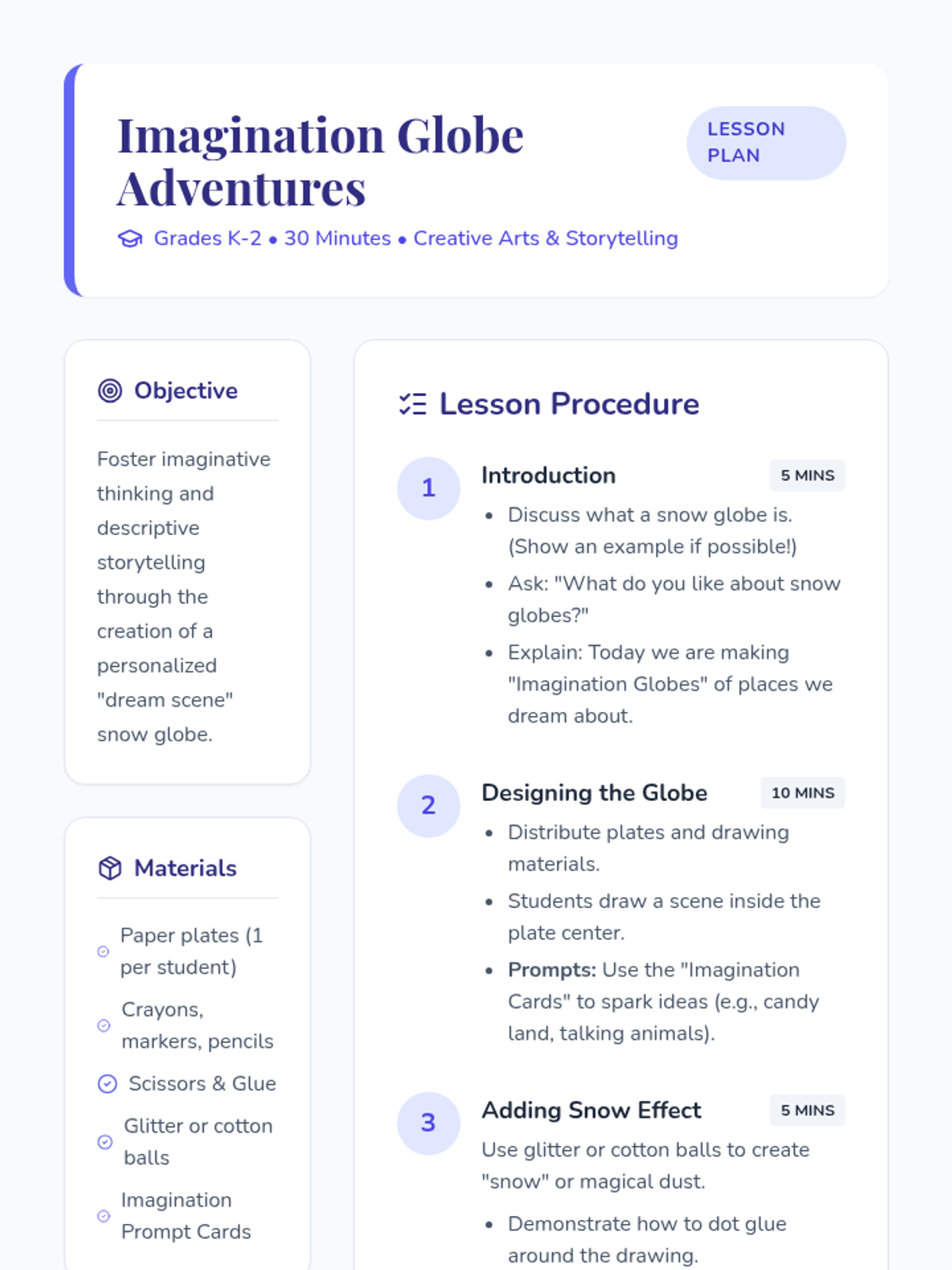 Students design personalized snow globes using paper plates to explore imaginative storytelling and creative expression. This K-2 lesson fosters dreaming and aspirational thinking through hands-on art.
