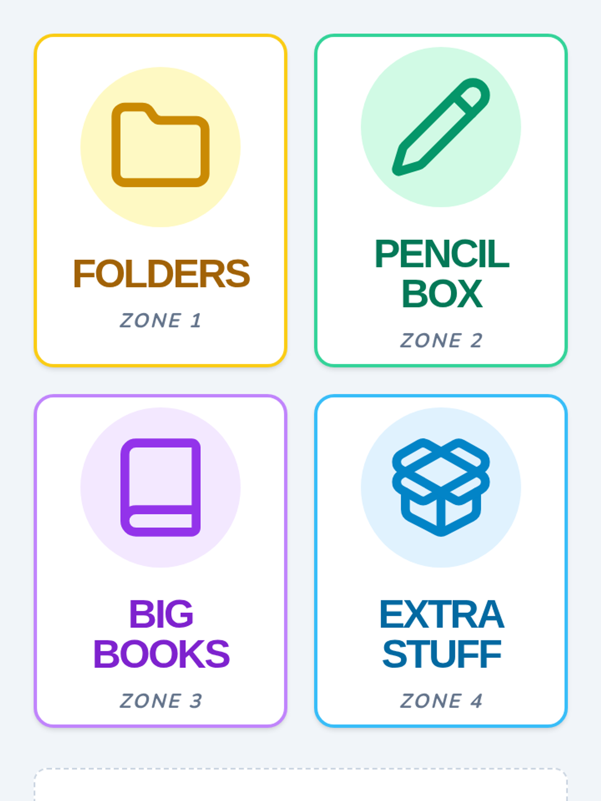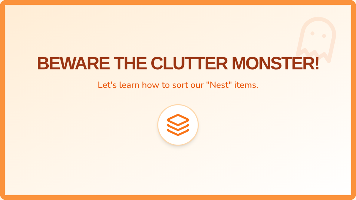 Students learn to sort their materials into specific categories within their bins. The lesson uses the 'Clutter Monster' concept to illustrate the importance of categorization.