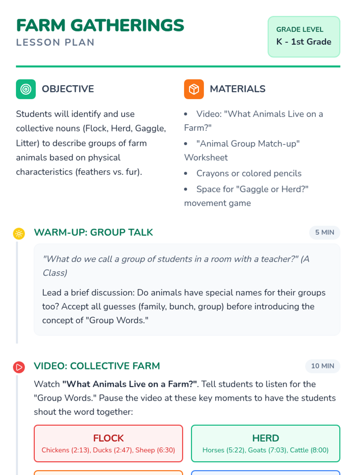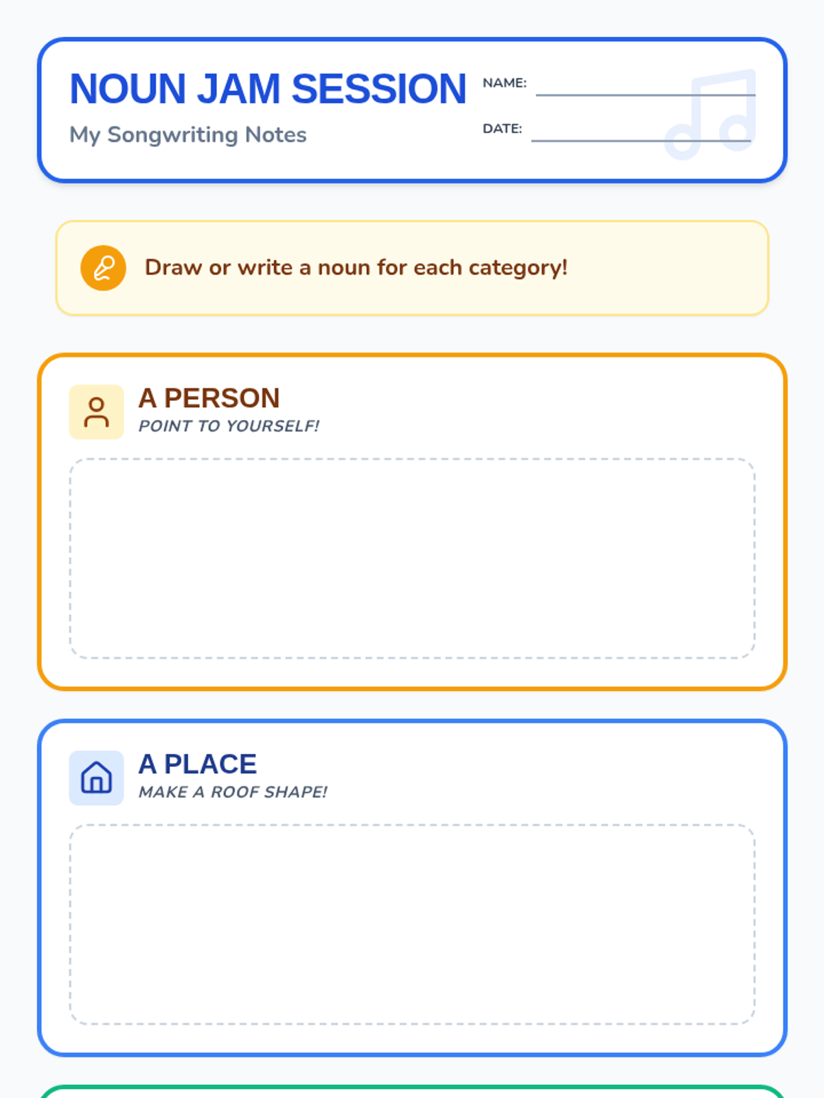 A foundational lesson for Pre-K and Kindergarten students to identify nouns as people, places, and things through visual cues and coloring activities.