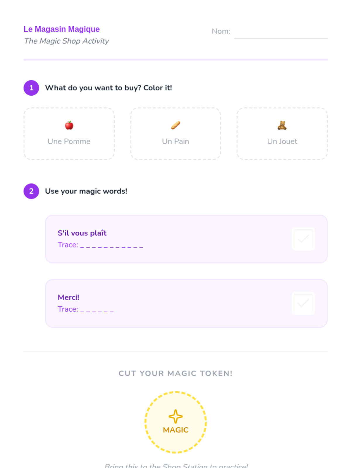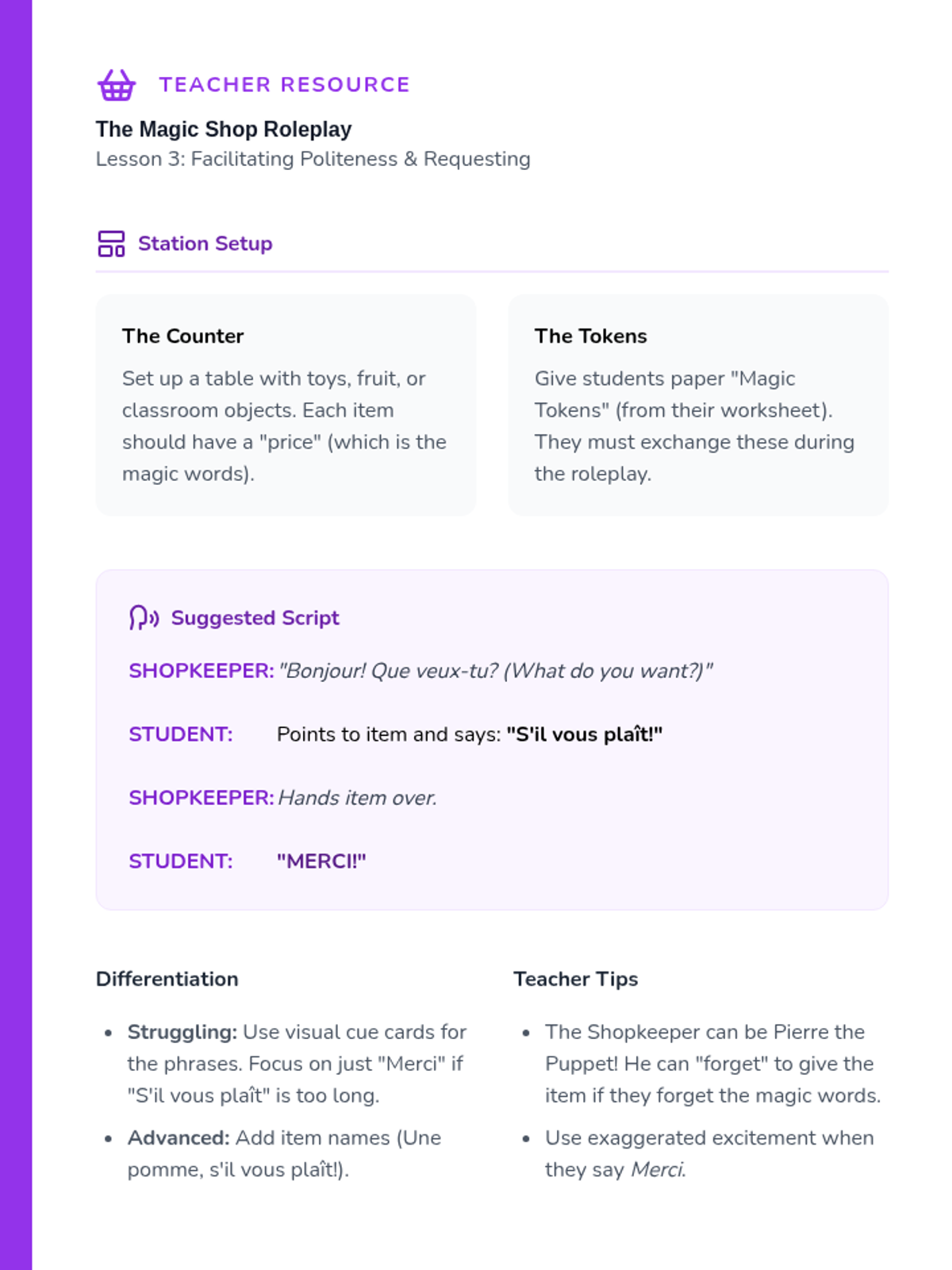 This lesson introduces 'S'il vous plaît' and 'Merci' through a dramatic play shop setup. Students practice requesting items and thanking the shopkeeper.