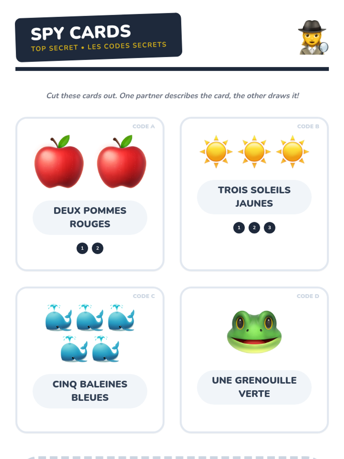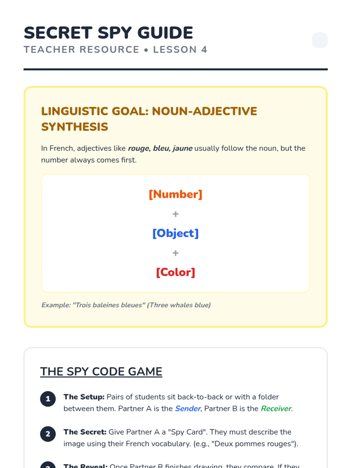 Students learn to synthesize adjectives and nouns: 'Deux pommes rouges'. They engage in a barrier game to describe simple arrangements to partners.