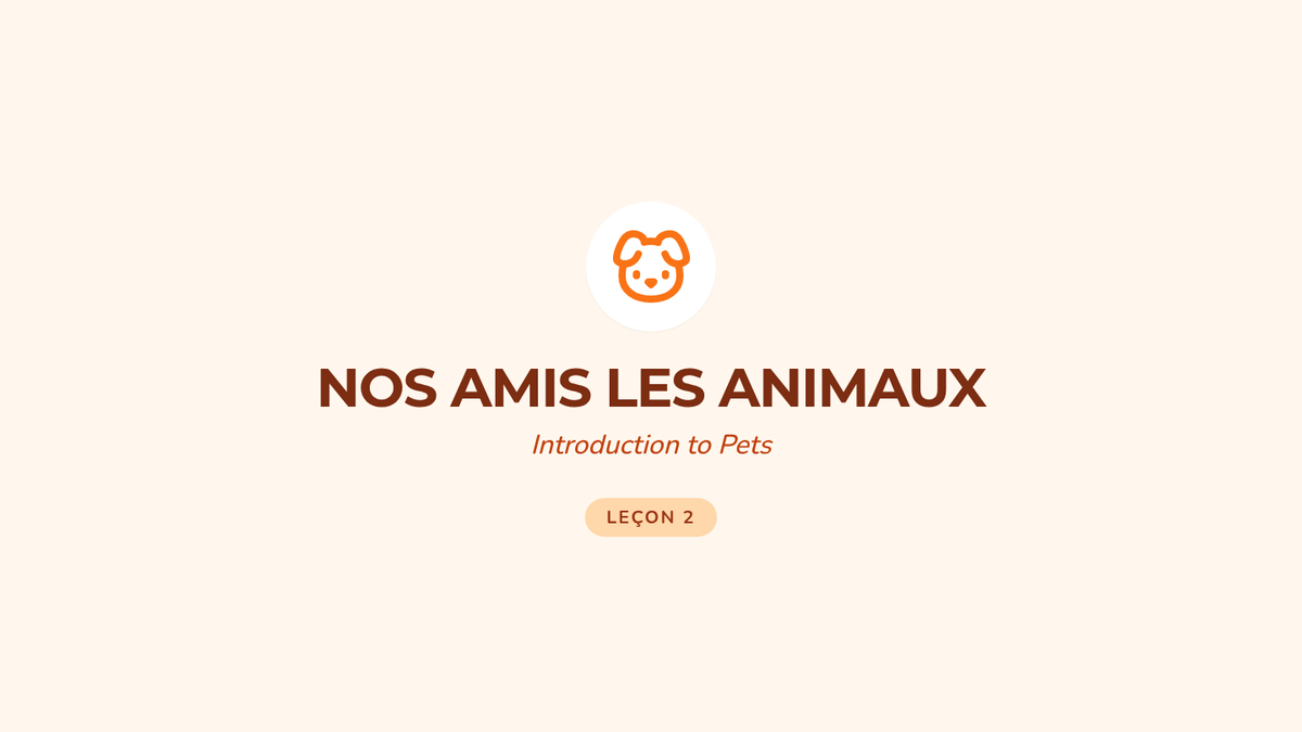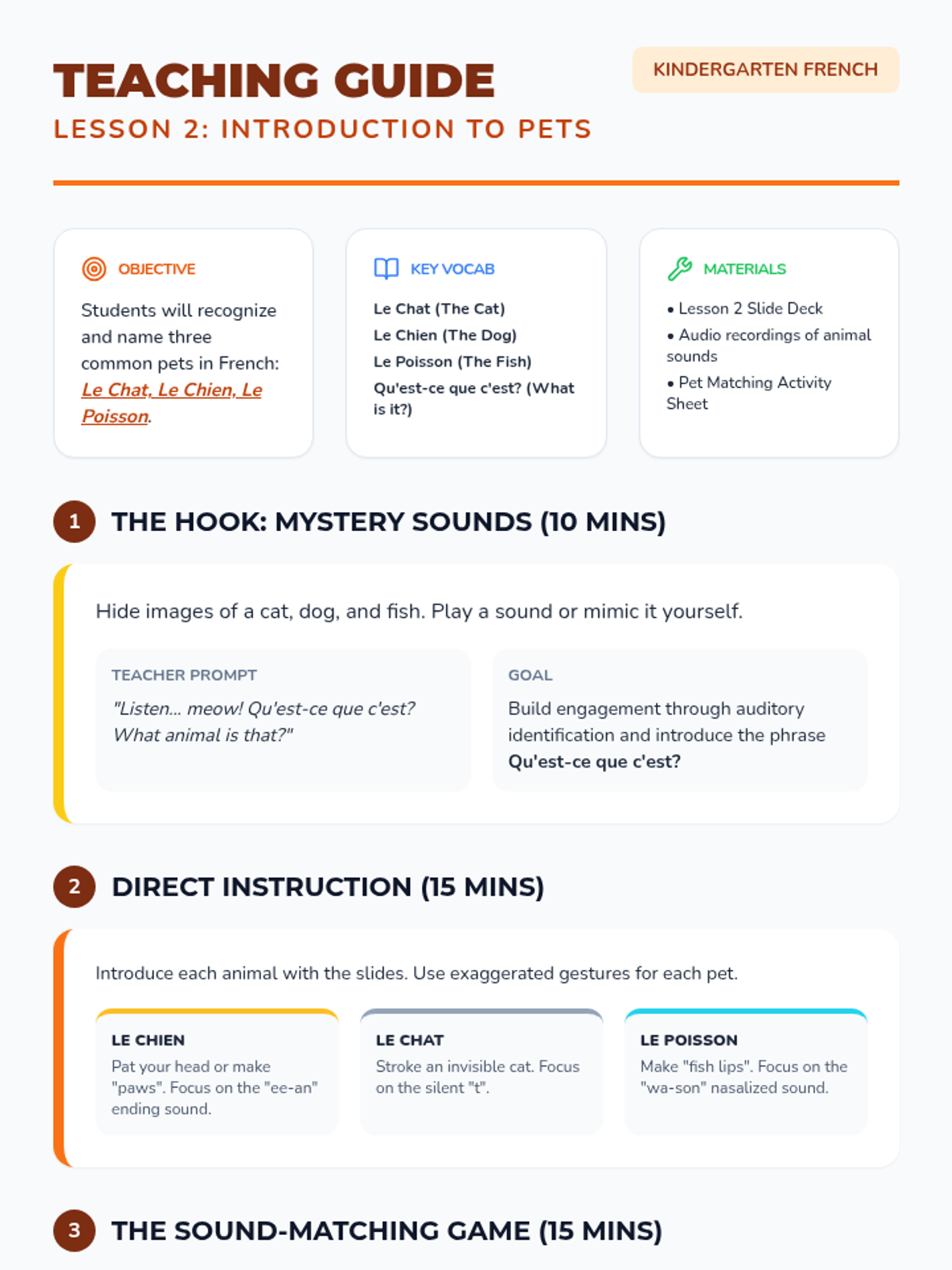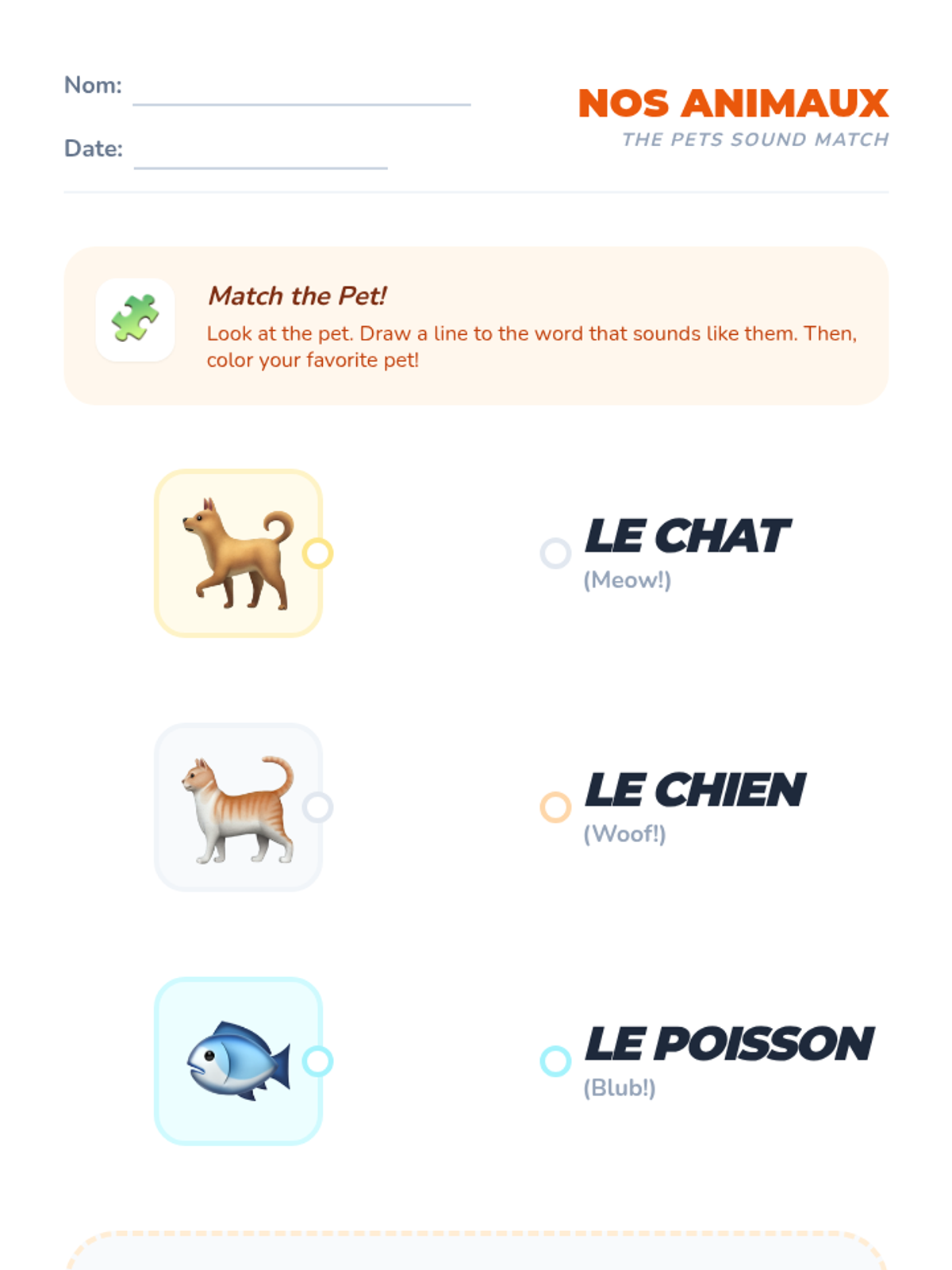 Students explore vocabulary for common pets (chat, chien, poisson) through a sound-matching game.
