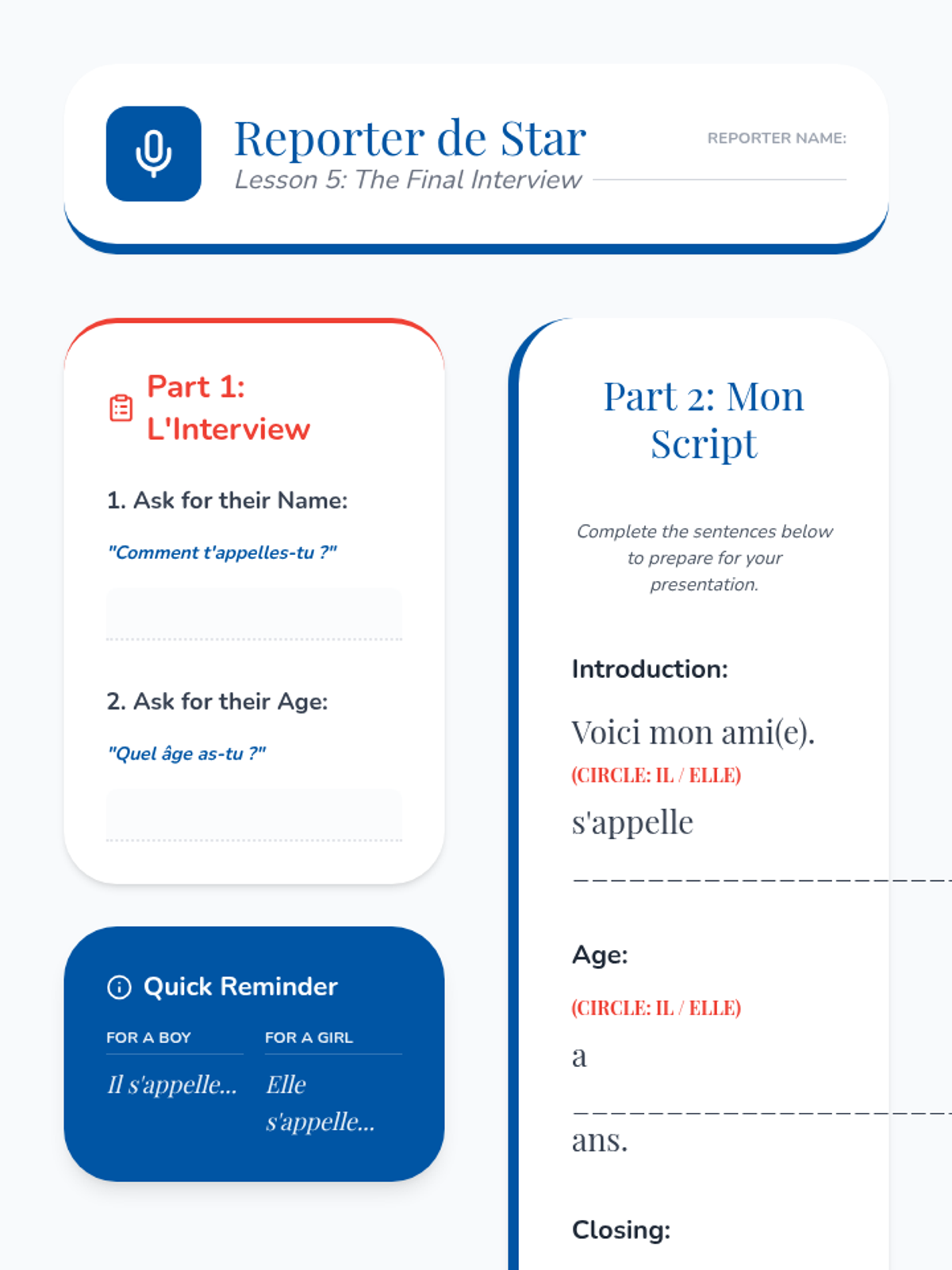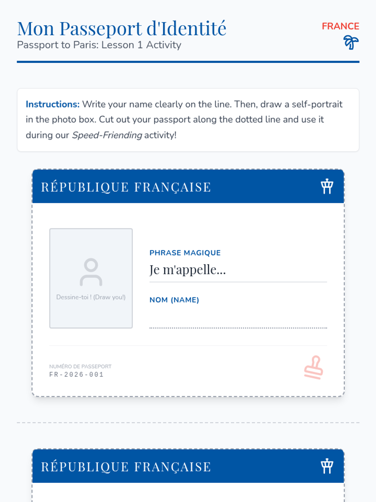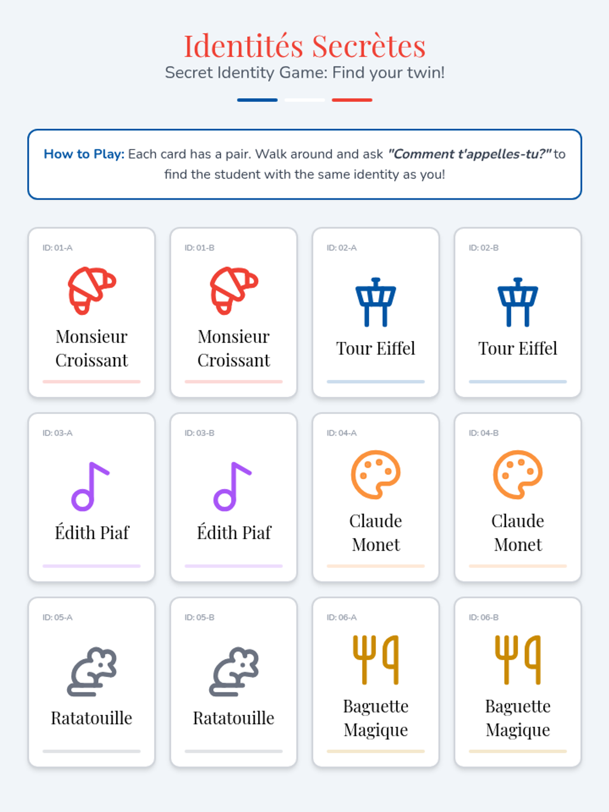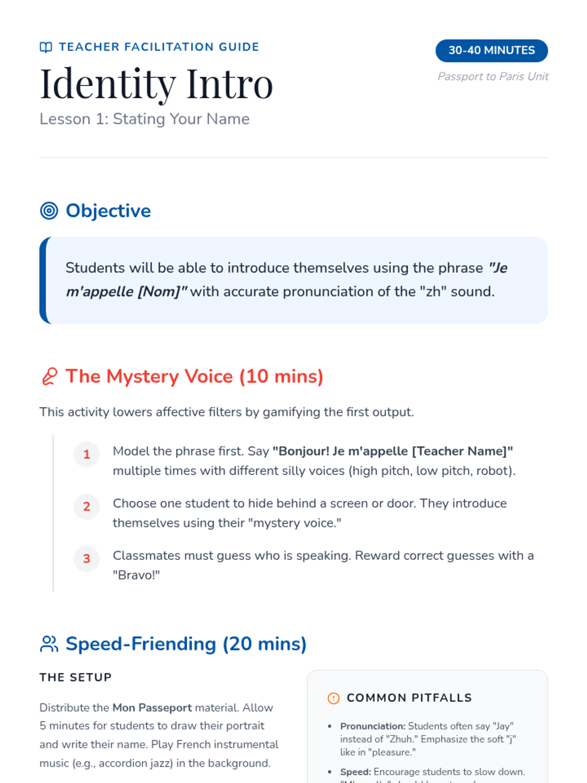 Students learn the phrase 'Je m'appelle' to introduce themselves and create personalized name tags for a speed-friending activity.