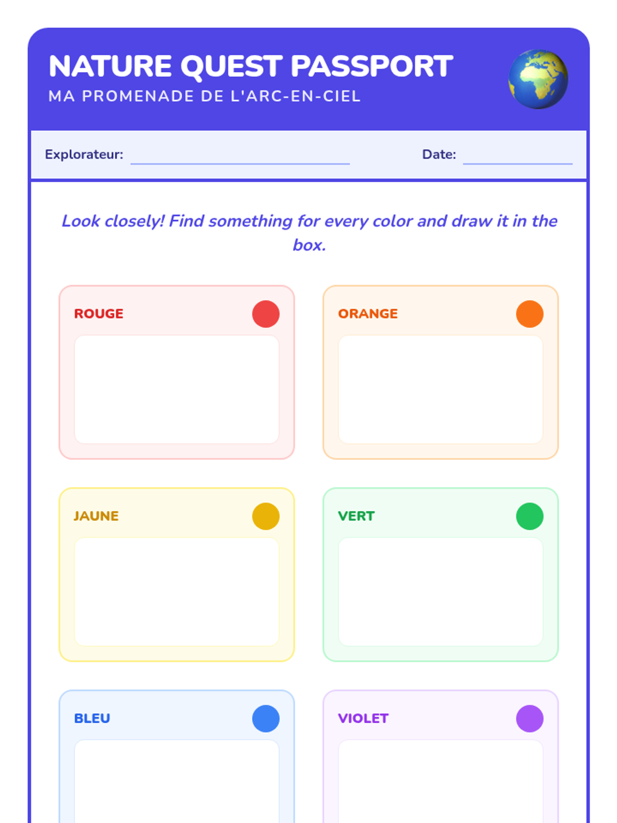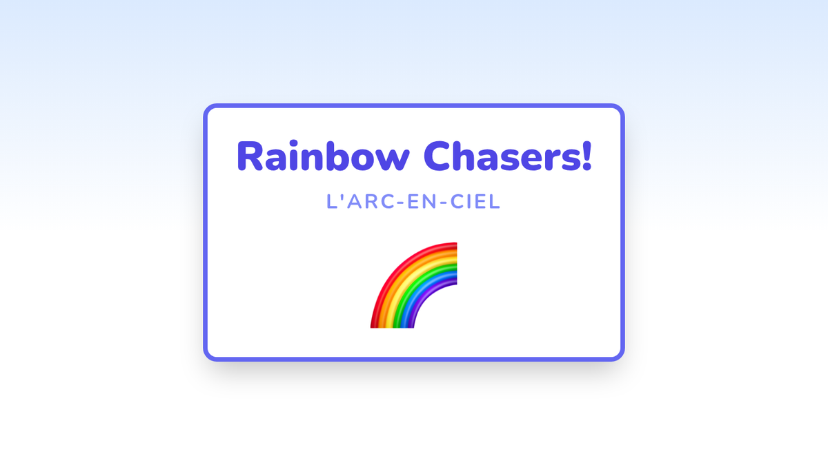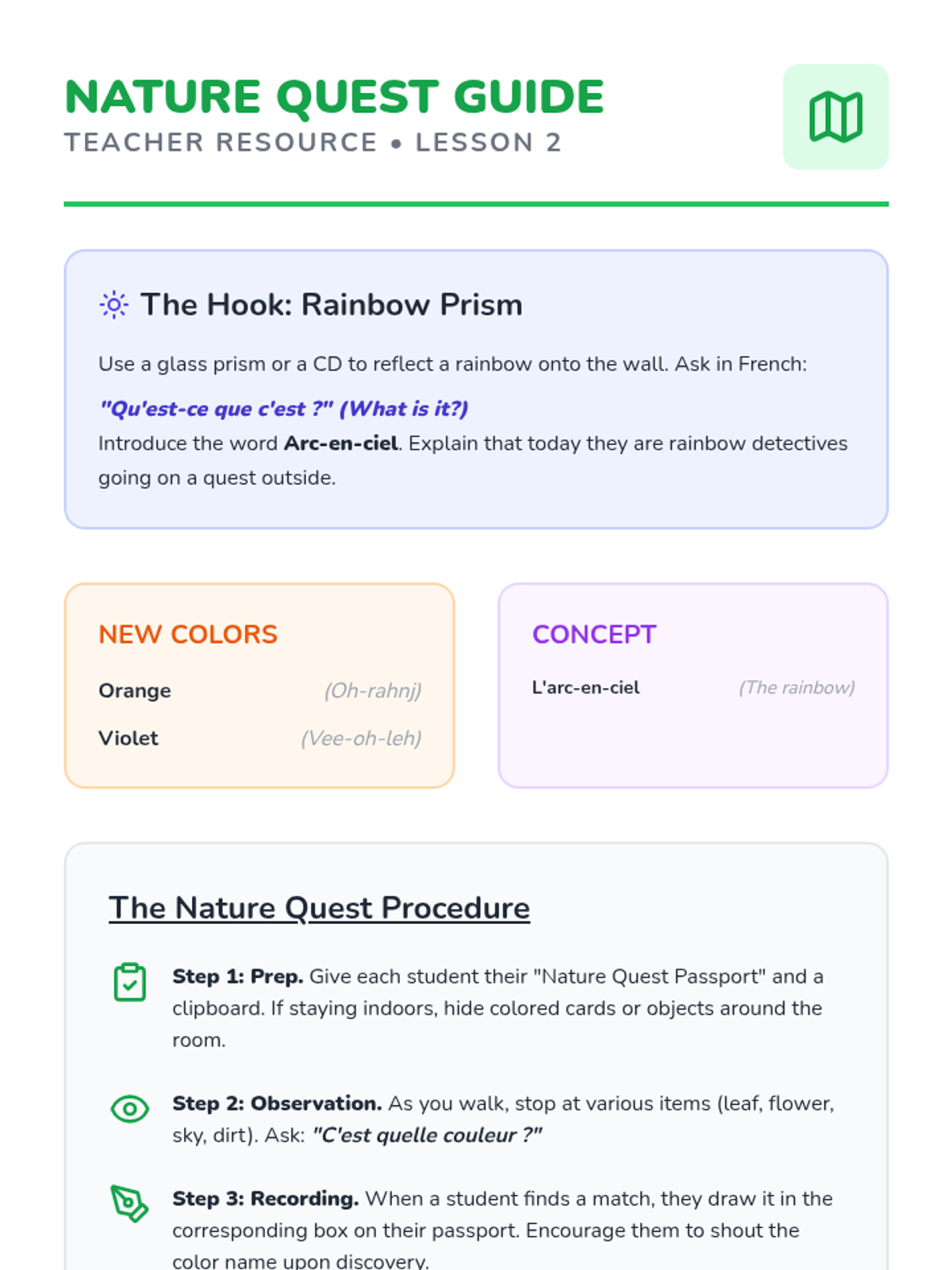 Expanding to secondary colors (Orange, Violet) and the concept of 'Arc-en-ciel' (Rainbow). Students go on a nature walk to find items matching color swatches.