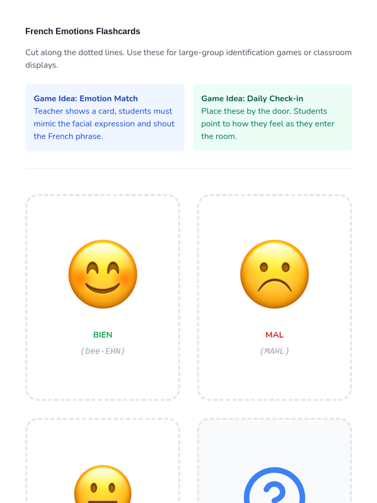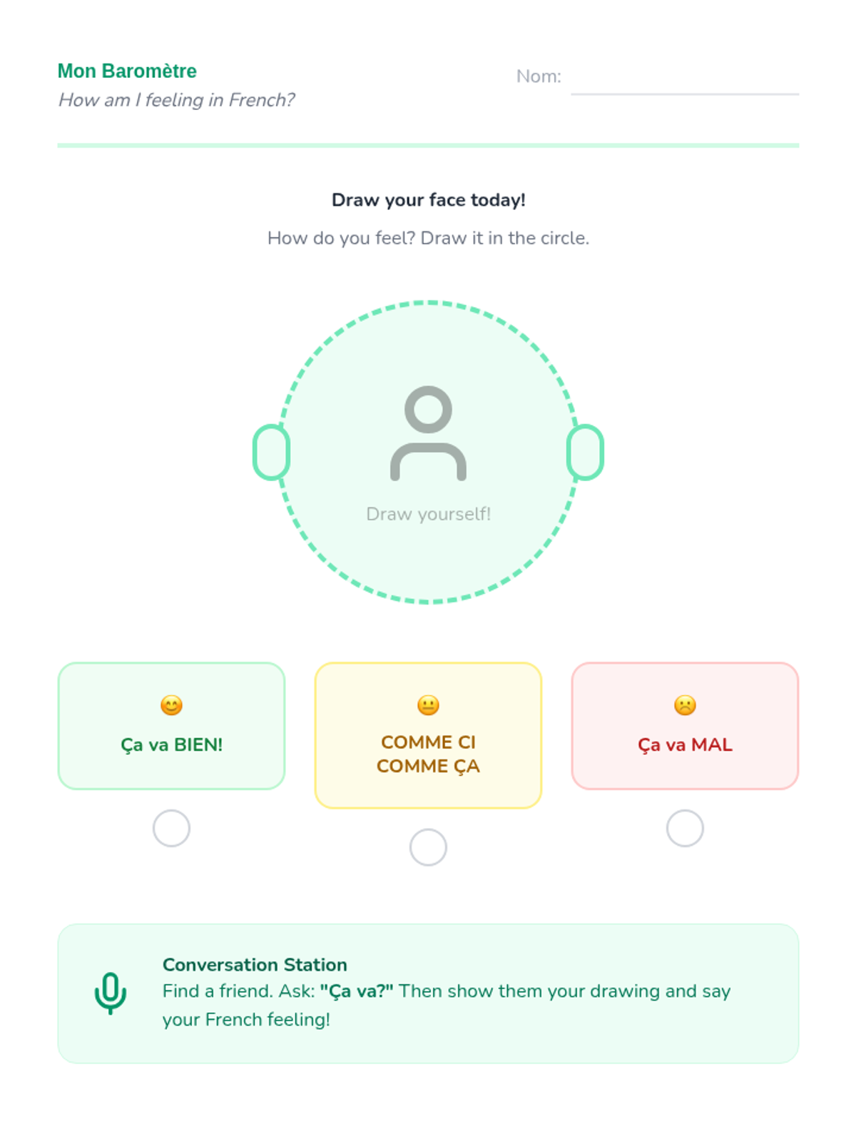 Students learn to ask 'Ça va?' and respond with simple emotional states (ça va bien, ça va mal, comme ci comme ça) using emotion flashcards and facial expressions.