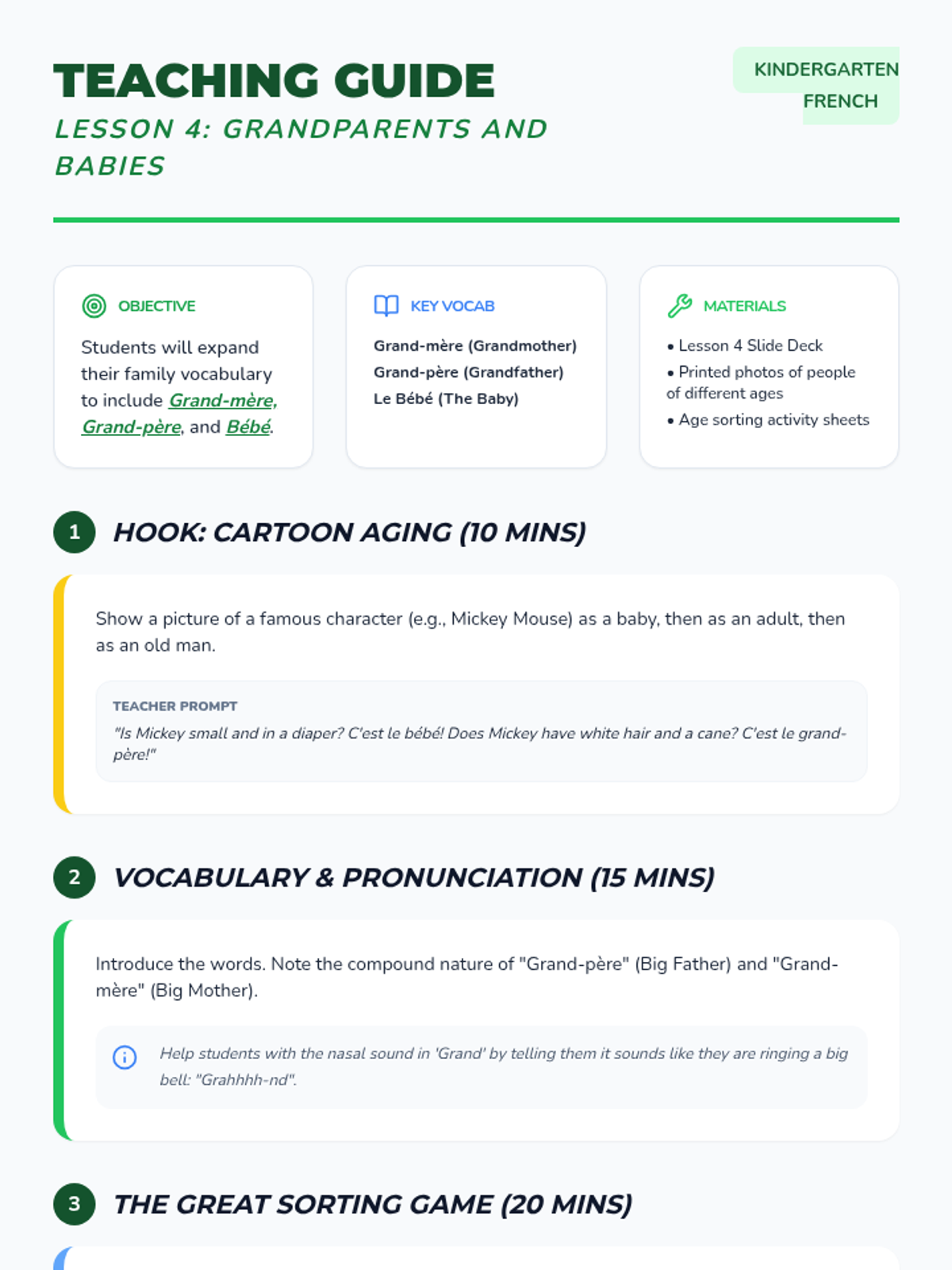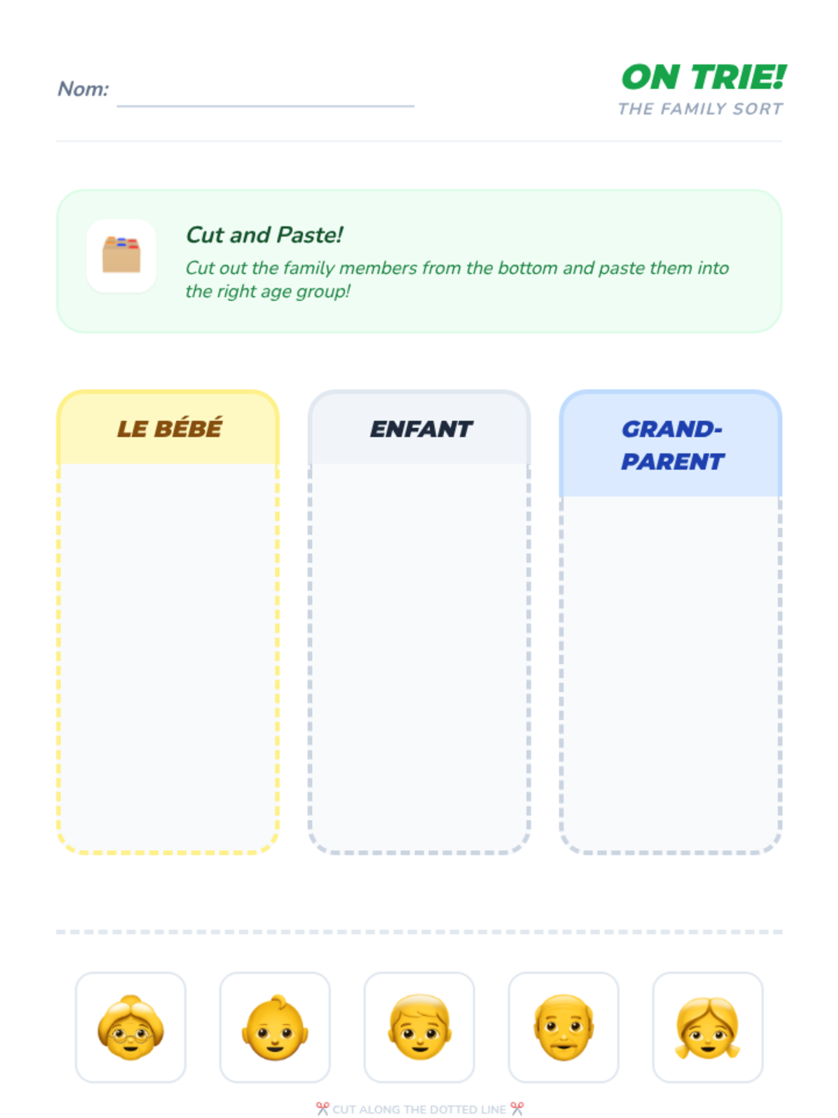 Expanding vocabulary to include 'Grand-mère', 'Grand-père', and 'Bébé' with age-based sorting activities.