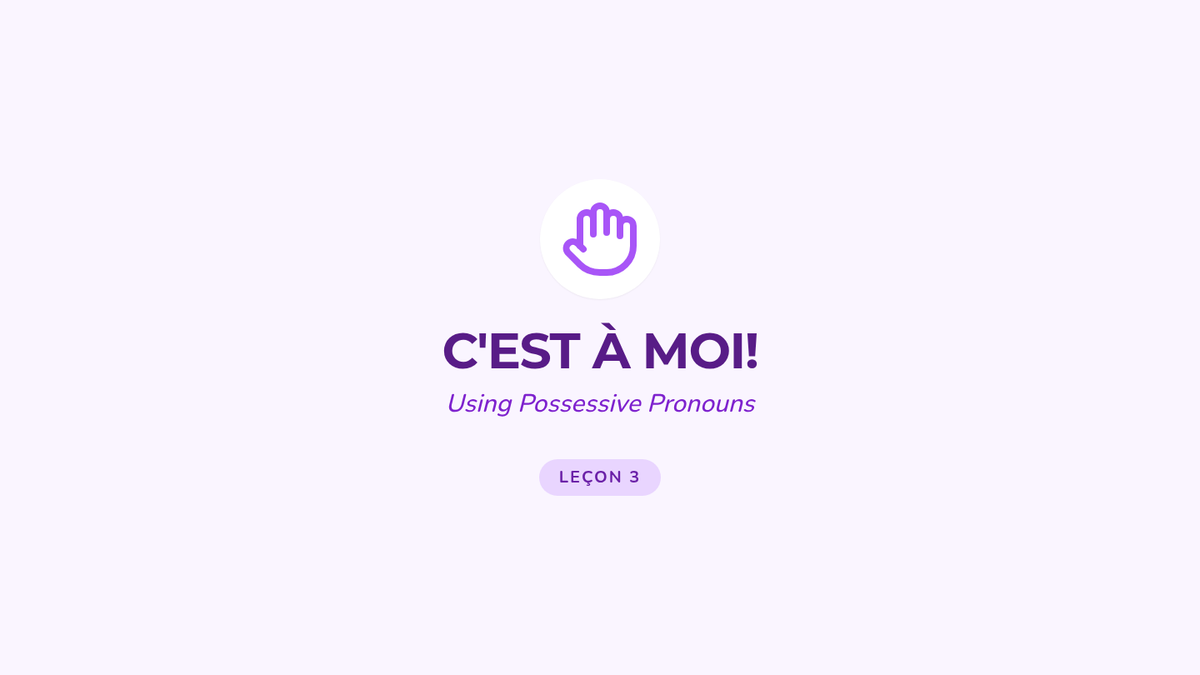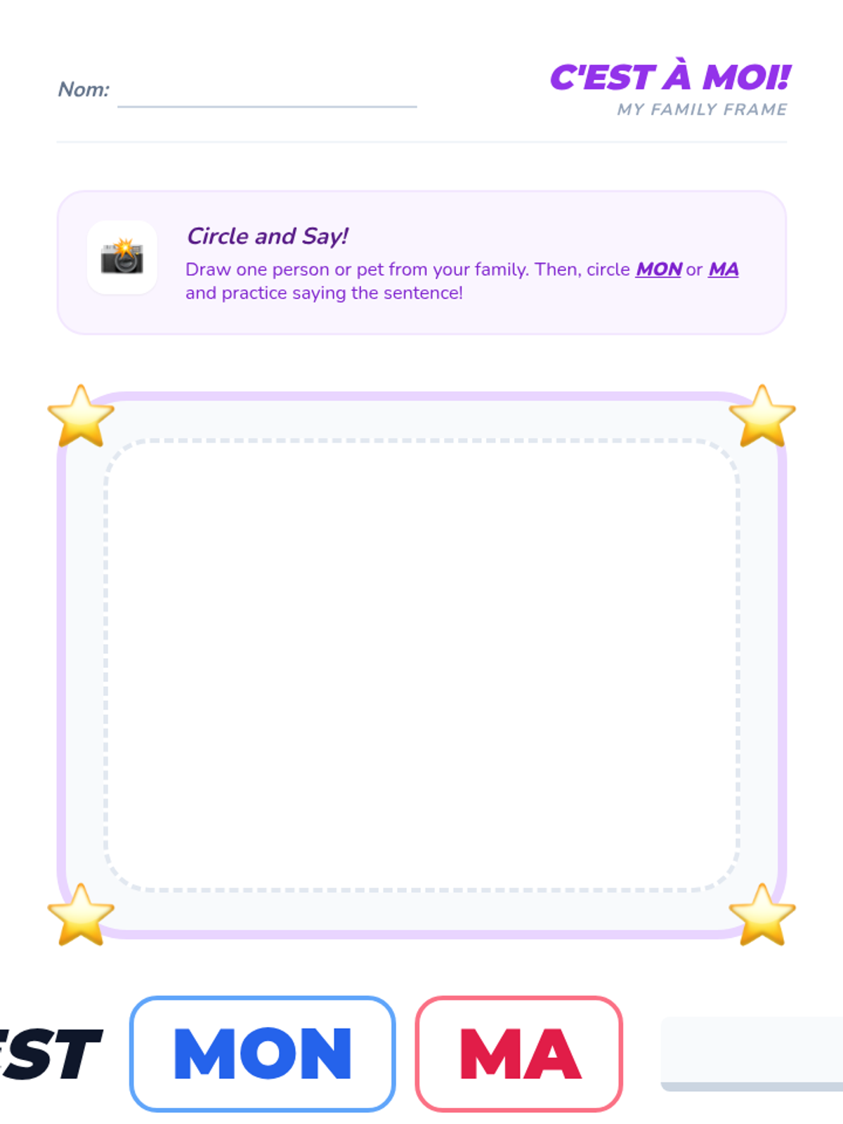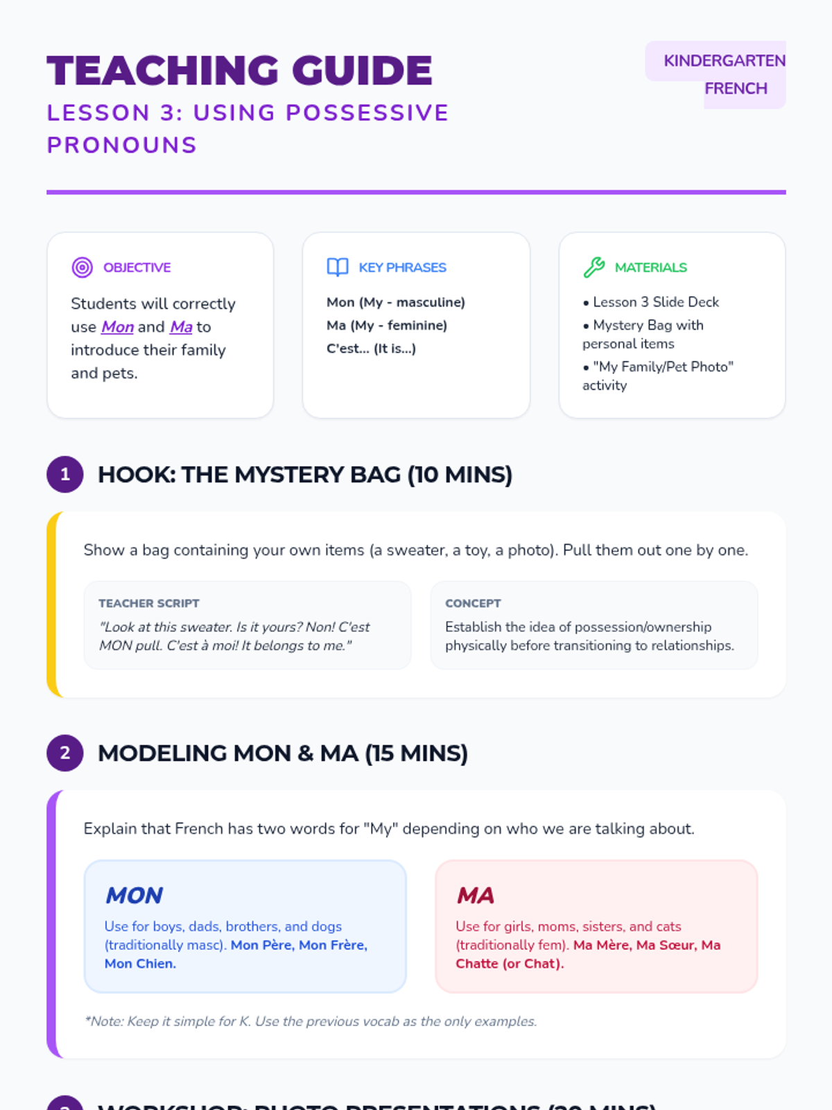 Students learn the concept of 'Mon' and 'Ma' (My) by practicing pointing to photos and using simple sentence structures.