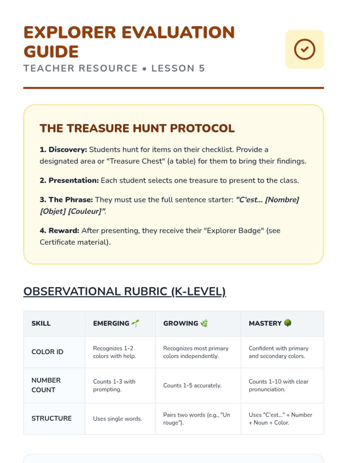 A culminating scavenger hunt where students find items based on descriptive clues and present findings using the phrase 'C'est...'.