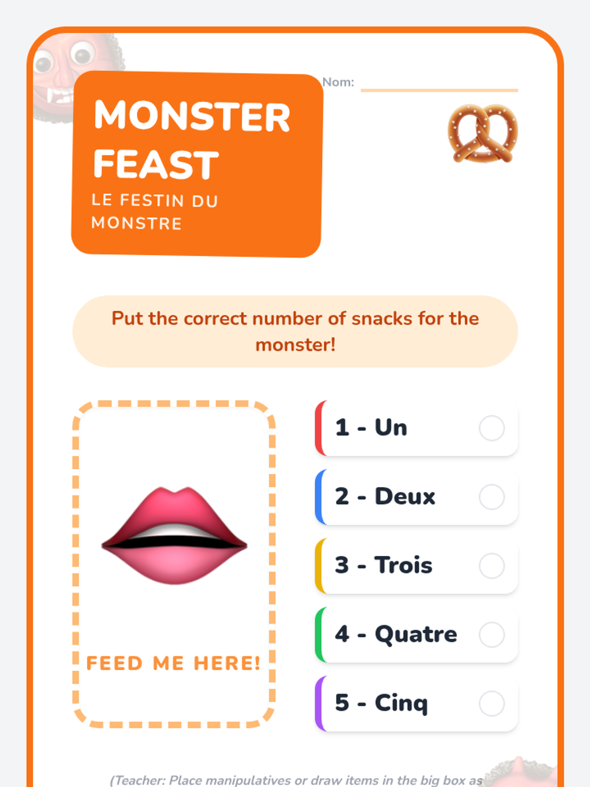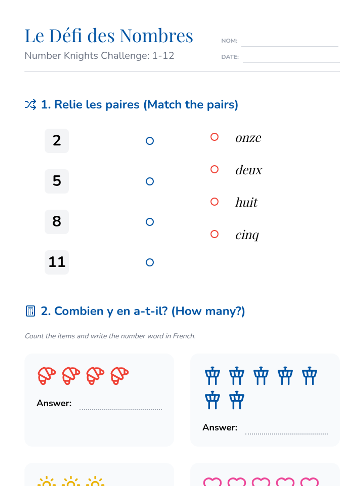 Reinforcing counting skills (1-10) with a focus on pronunciation. Students use manipulatives to build towers corresponding to spoken French numbers.